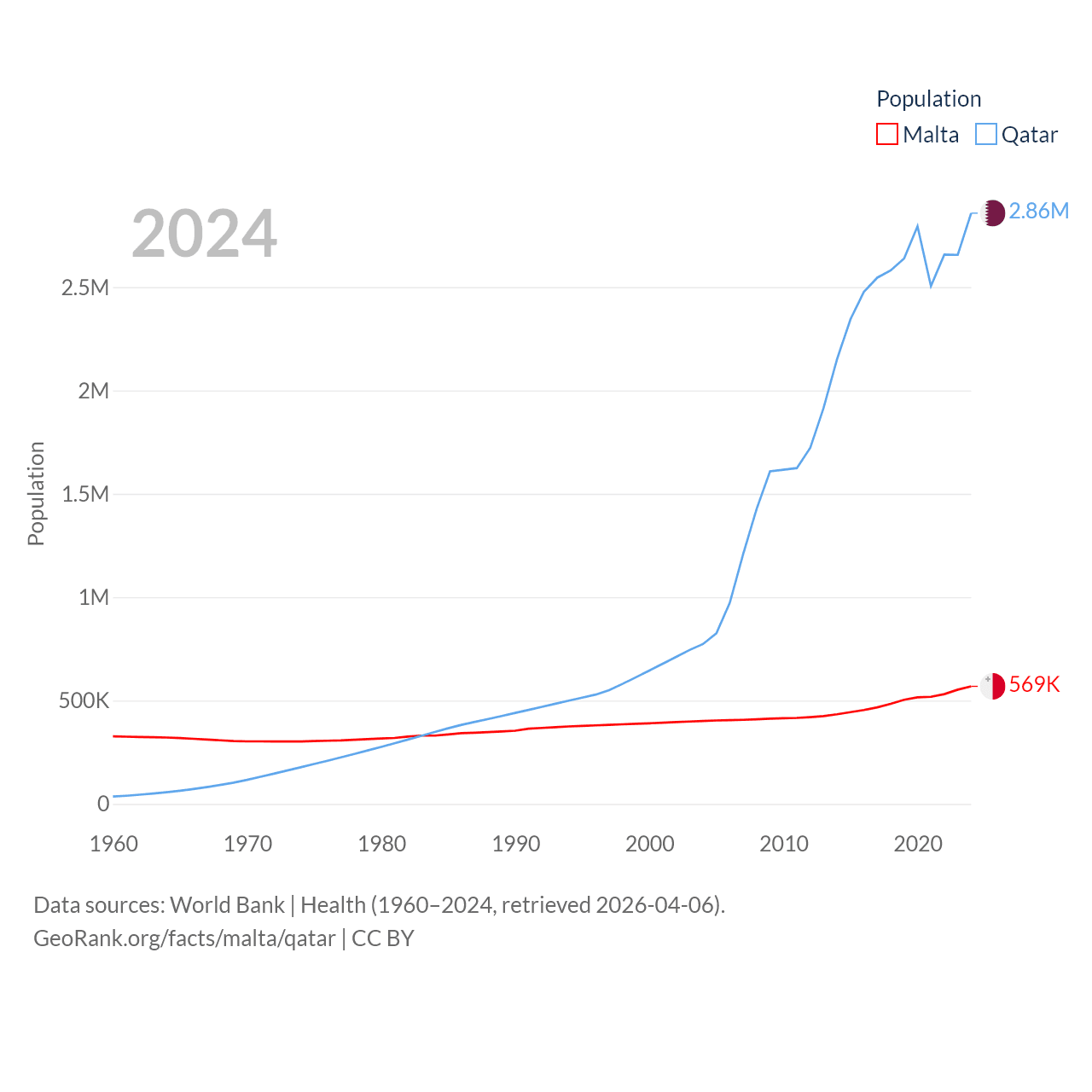 Malta has a population of 569K (ranked 167/197), compared with 2.86M in Qatar (ranked 138/197). Malta's land area is 123.6 sq mi versus 4,436 sq mi for Qatar (ranked 187th vs. 158th).