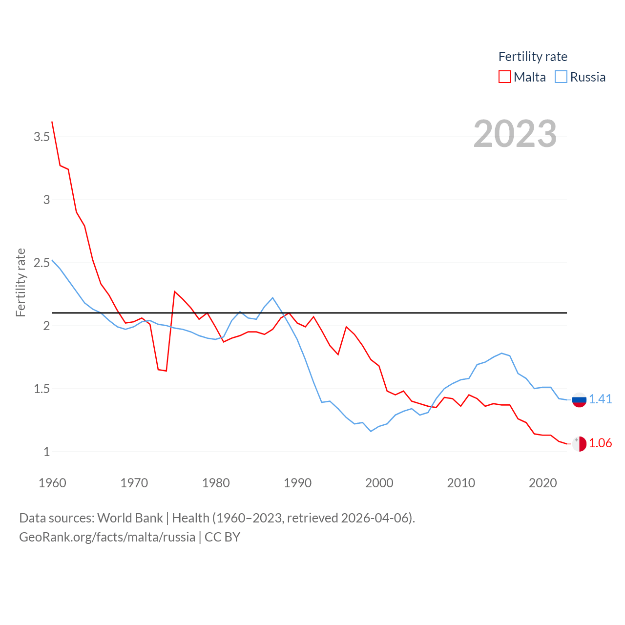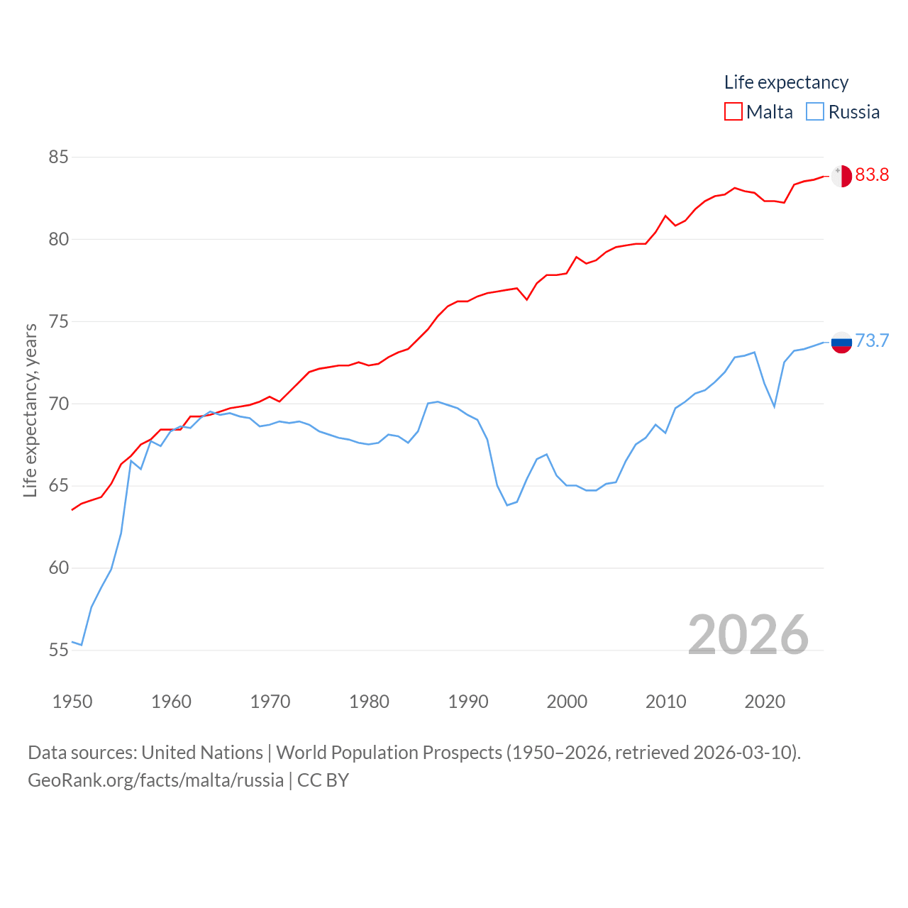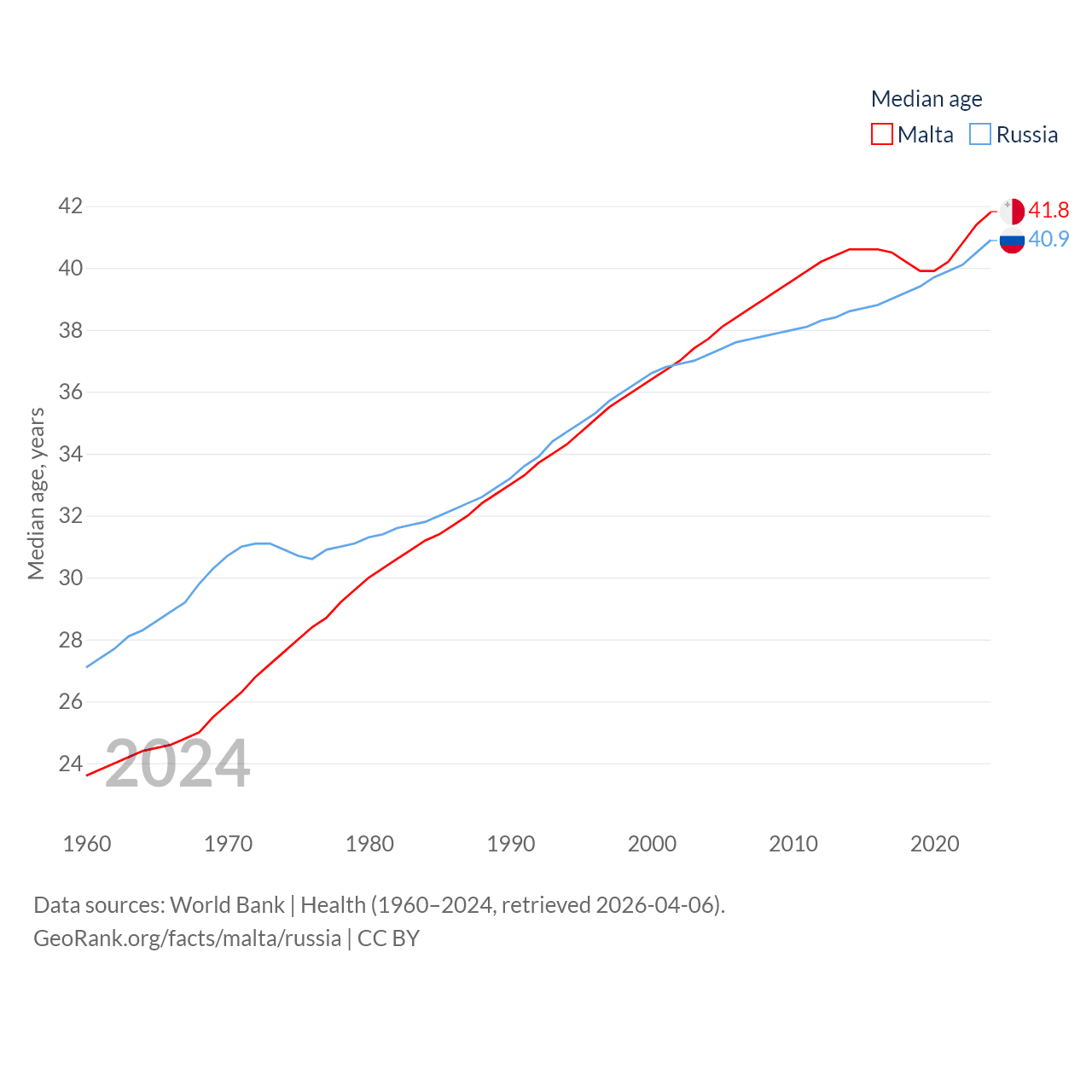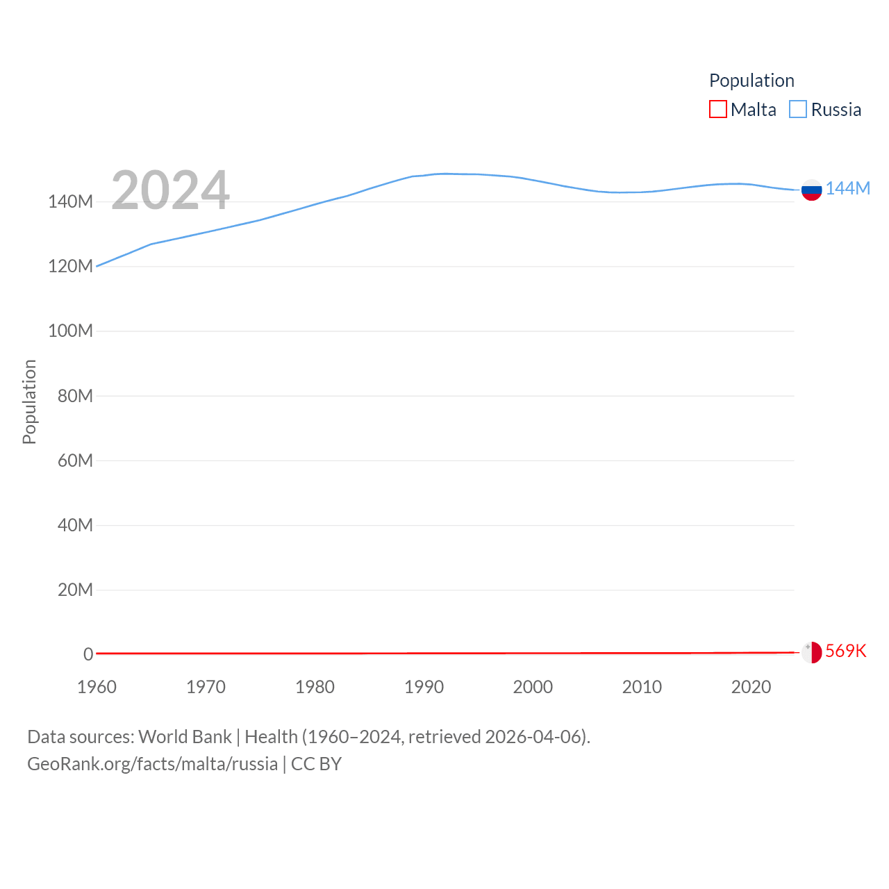 Malta has a population of 569K (ranked 167/197), compared with 144M in Russia (ranked 9/197). Malta's land area is 123.6 sq mi versus 6,323,145 sq mi for Russia (ranked 187th vs. 1st).