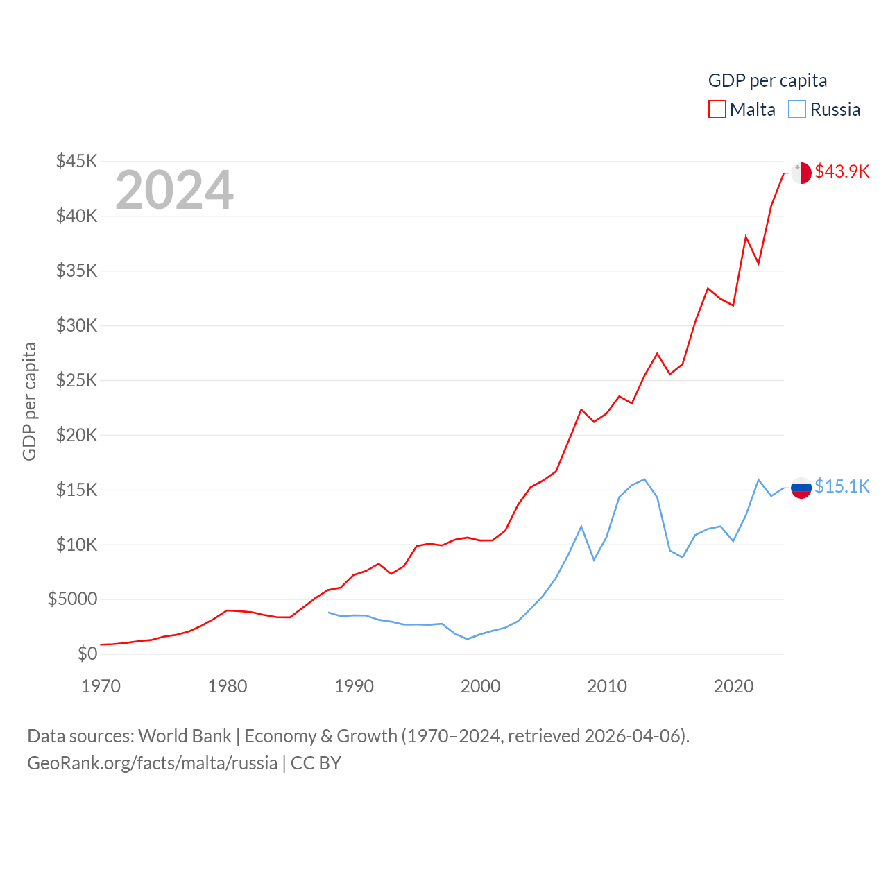 By GDP, Malta ranks 119/197 ($25B) and Russia ranks 11/197 ($2.17T). By GDP per capita, Malta ranks 28/197 ($43,899), while Russia ranks 68/197 ($15,145).