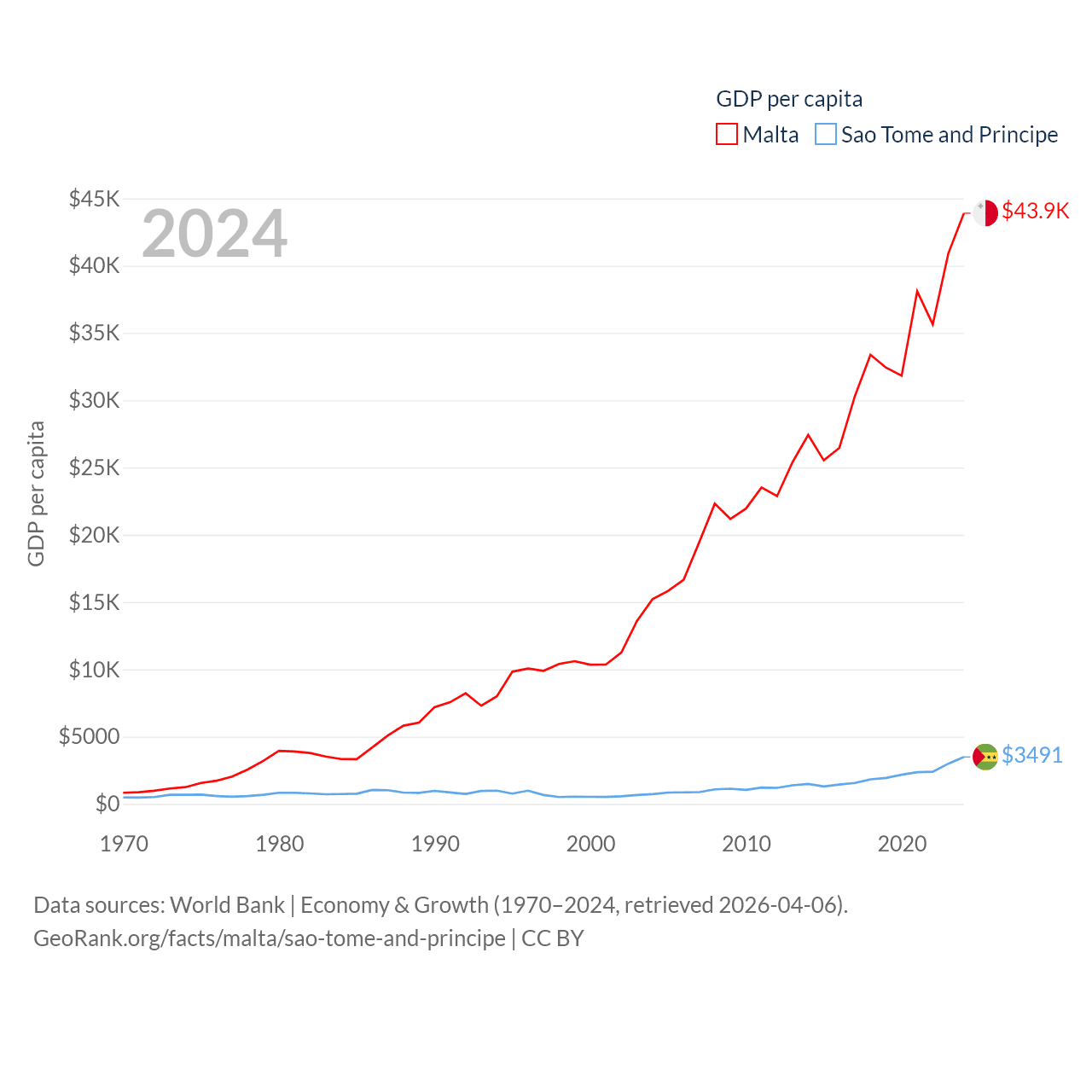By GDP, Malta ranks 119/197 ($25B) and Sao Tome and Principe ranks 189/197 ($822M). By GDP per capita, Malta ranks 28/197 ($43,899), while Sao Tome and Principe ranks 134/197 ($3,491).