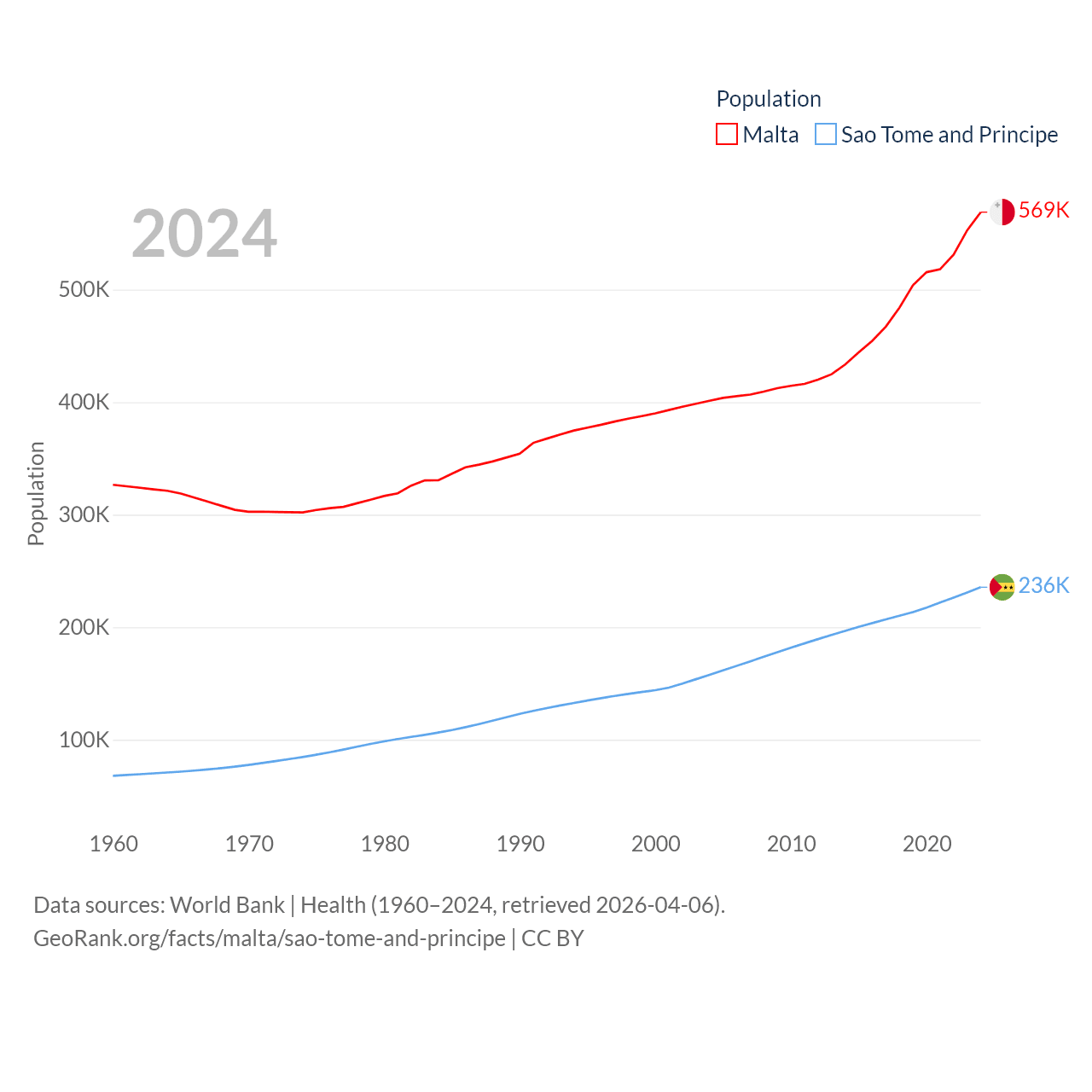 Malta has a population of 569K (ranked 167/197), compared with 236K in Sao Tome and Principe (ranked 176/197). Malta's land area is 123.6 sq mi versus 371 sq mi for Sao Tome and Principe (ranked 187th vs. 172nd).