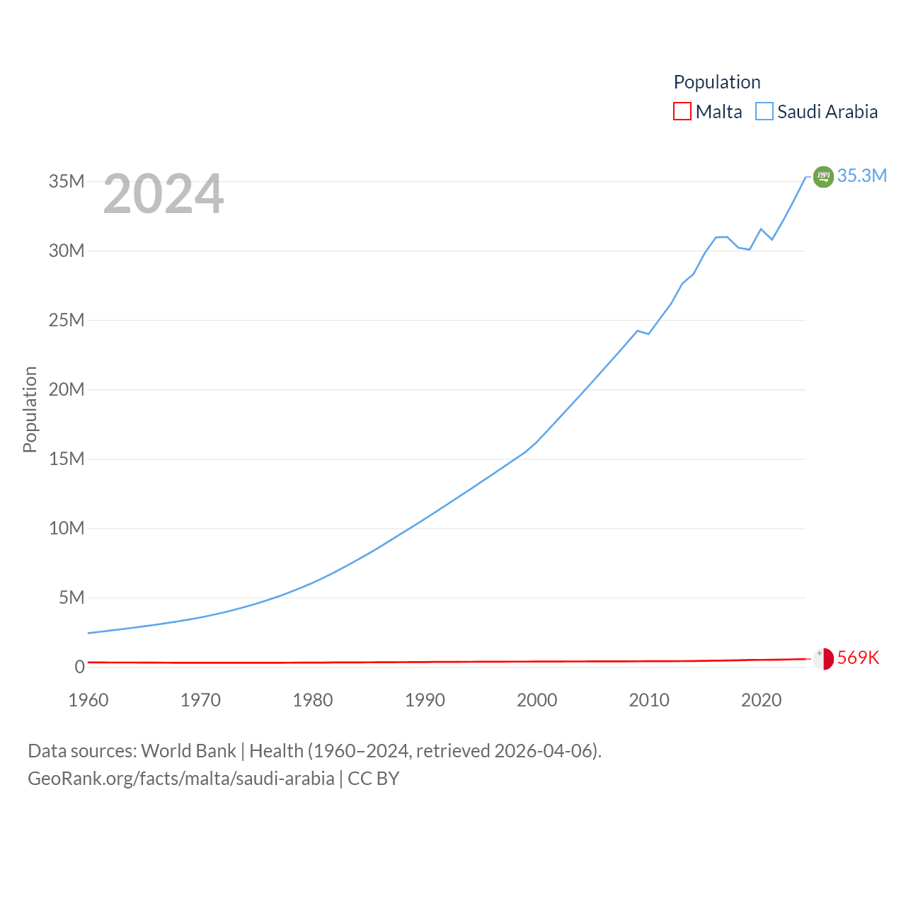 Malta has a population of 569K (ranked 167/197), compared with 35.3M in Saudi Arabia (ranked 45/197). Malta's land area is 123.6 sq mi versus 830,000 sq mi for Saudi Arabia (ranked 187th vs. 12th).