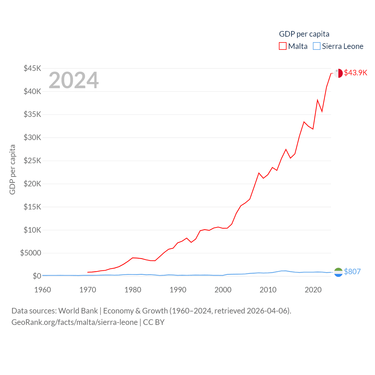 By GDP, Malta ranks 119/197 ($25B) and Sierra Leone ranks 160/197 ($6.97B). By GDP per capita, Malta ranks 28/197 ($43,899), while Sierra Leone ranks 186/197 ($807).
