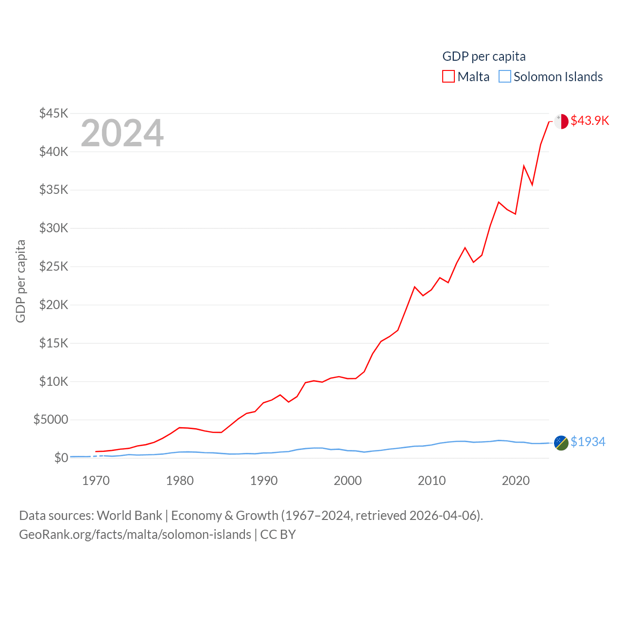 By GDP, Malta ranks 119/197 ($25B) and The Solomon Islands ranks 182/197 ($1.58B). By GDP per capita, Malta ranks 28/197 ($43,899), while The Solomon Islands ranks 157/197 ($1,934).