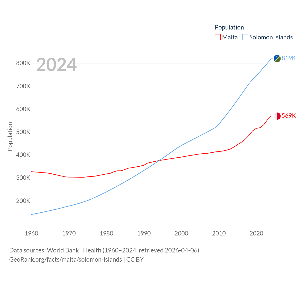 Malta has a population of 569K (ranked 167/197), compared with 819K in The Solomon Islands (ranked 162/197). Malta's land area is 123.6 sq mi versus 10,807 sq mi for The Solomon Islands (ranked 187th vs. 141st).