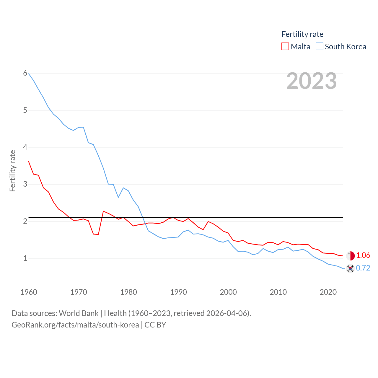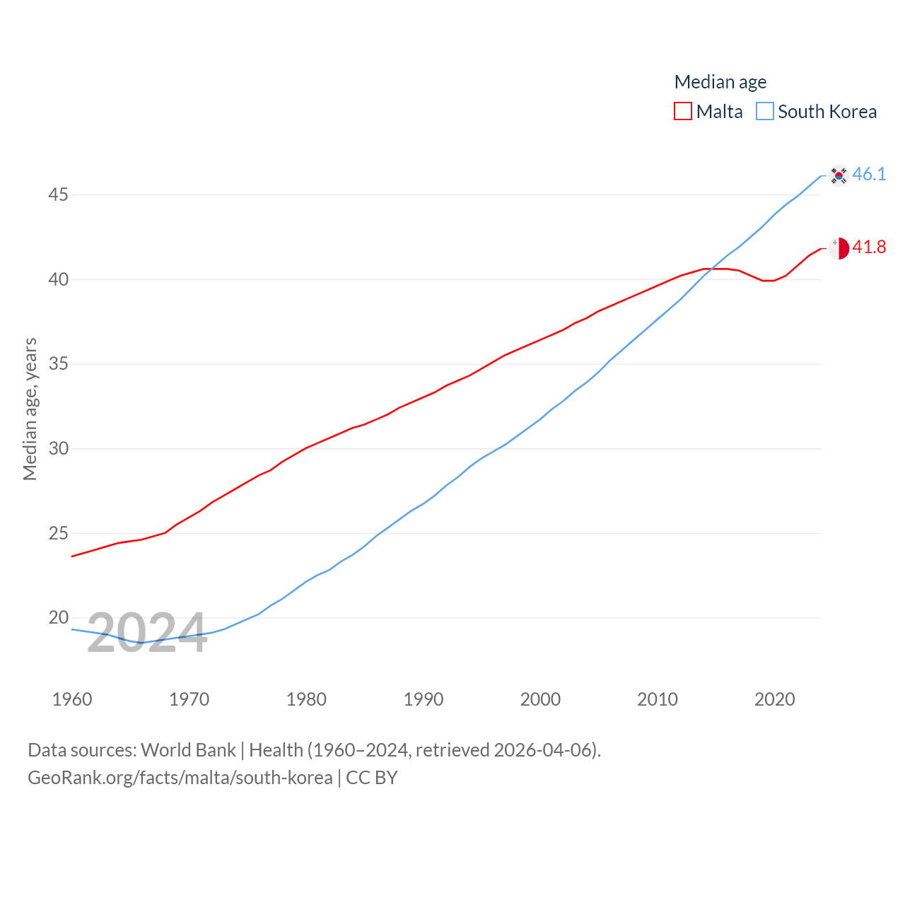 Malta has a population of 569K (ranked 167/197), compared with 51.8M in South Korea (ranked 29/197). Malta's land area is 123.6 sq mi versus 37,684 sq mi for South Korea (ranked 187th vs. 105th).