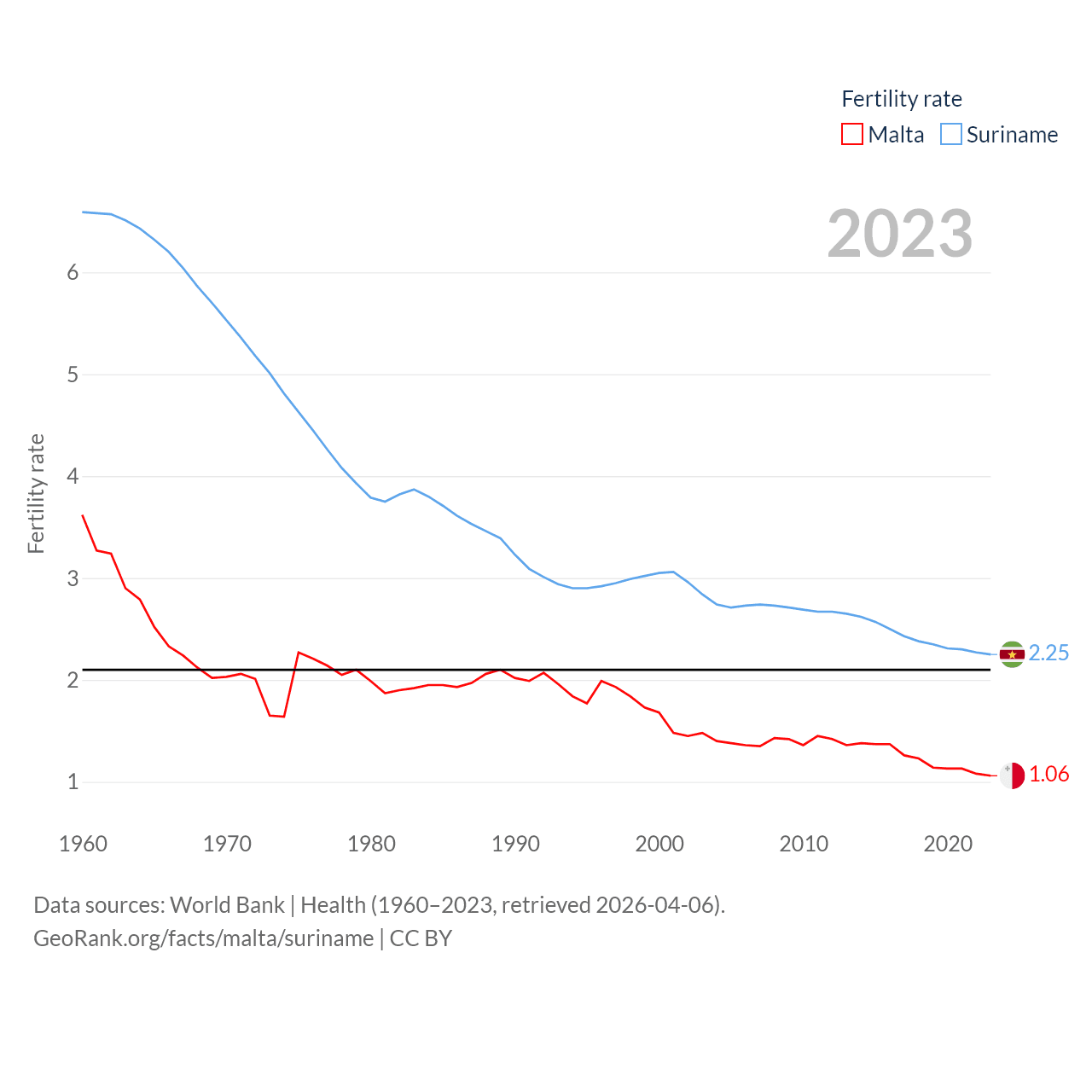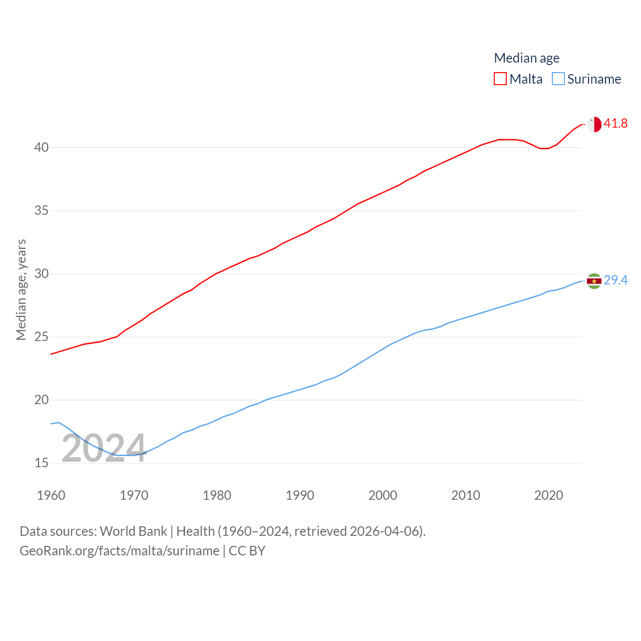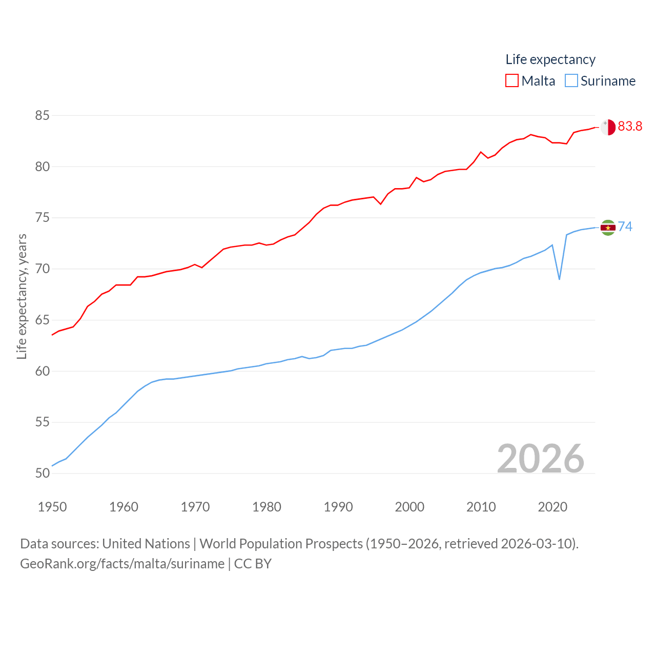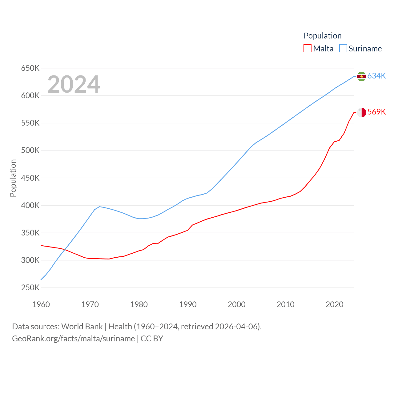 Malta has a population of 569K (ranked 167/197), compared with 634K in Suriname (ranked 165/197). Malta's land area is 123.6 sq mi versus 61,972 sq mi for Suriname (ranked 187th vs. 90th).