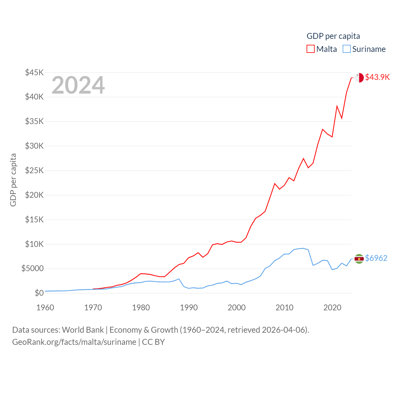 By GDP, Malta ranks 119/197 ($25B) and Suriname ranks 164/197 ($4.42B). By GDP per capita, Malta ranks 28/197 ($43,899), while Suriname ranks 102/197 ($6,962).