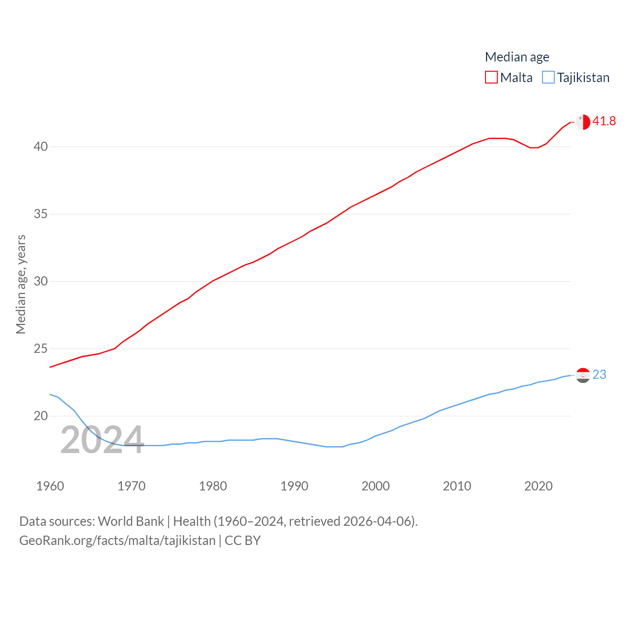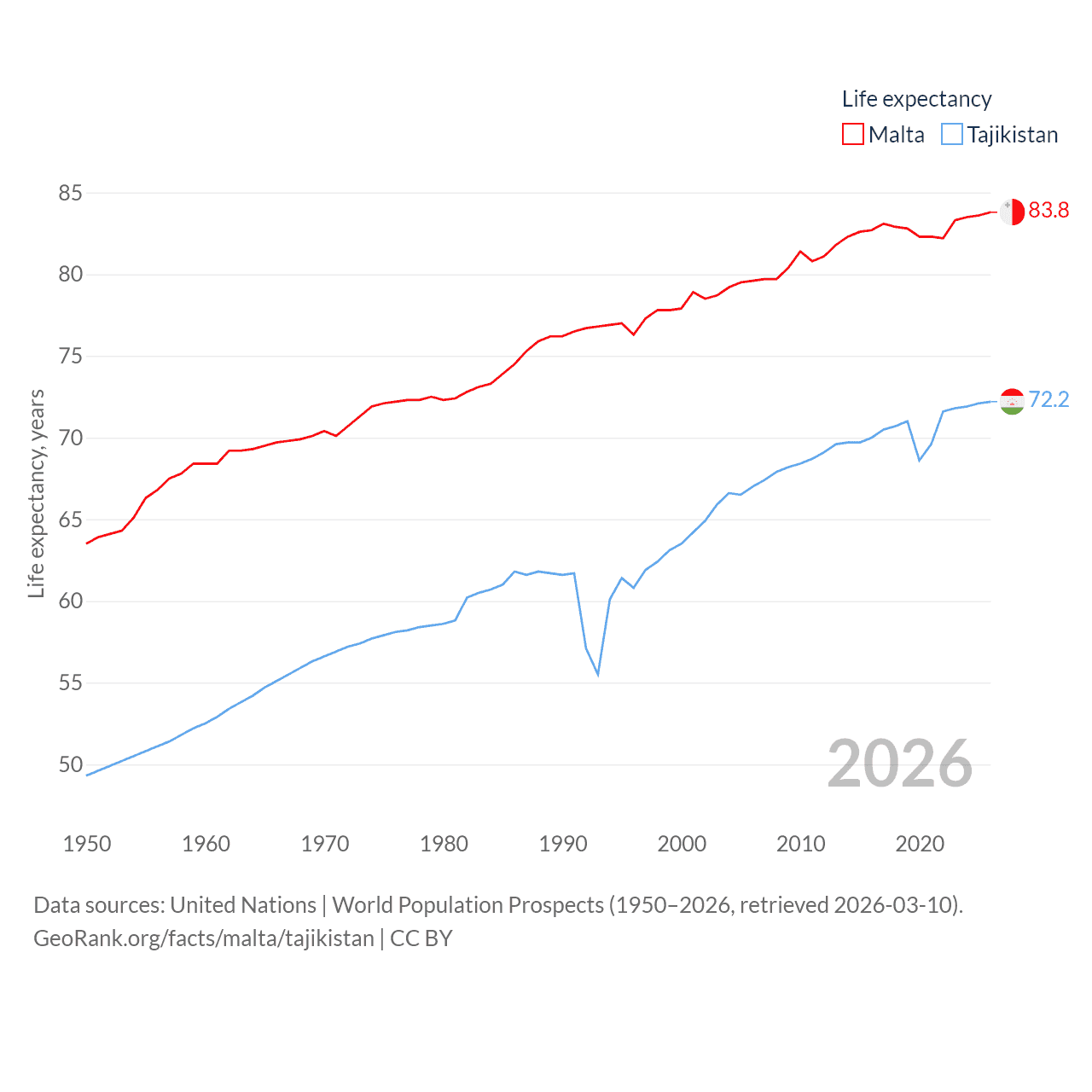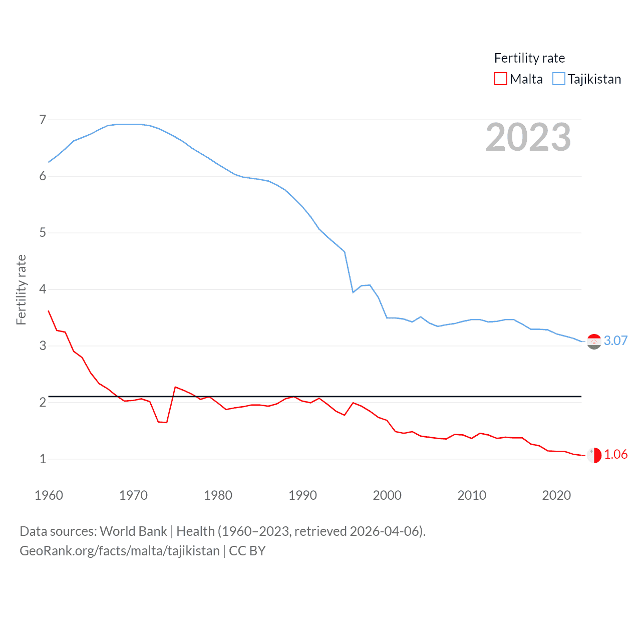 Malta has a population of 569K (ranked 167/197), compared with 10.6M in Tajikistan (ranked 91/197). Malta's land area is 123.6 sq mi versus 53,587 sq mi for Tajikistan (ranked 187th vs. 93rd).