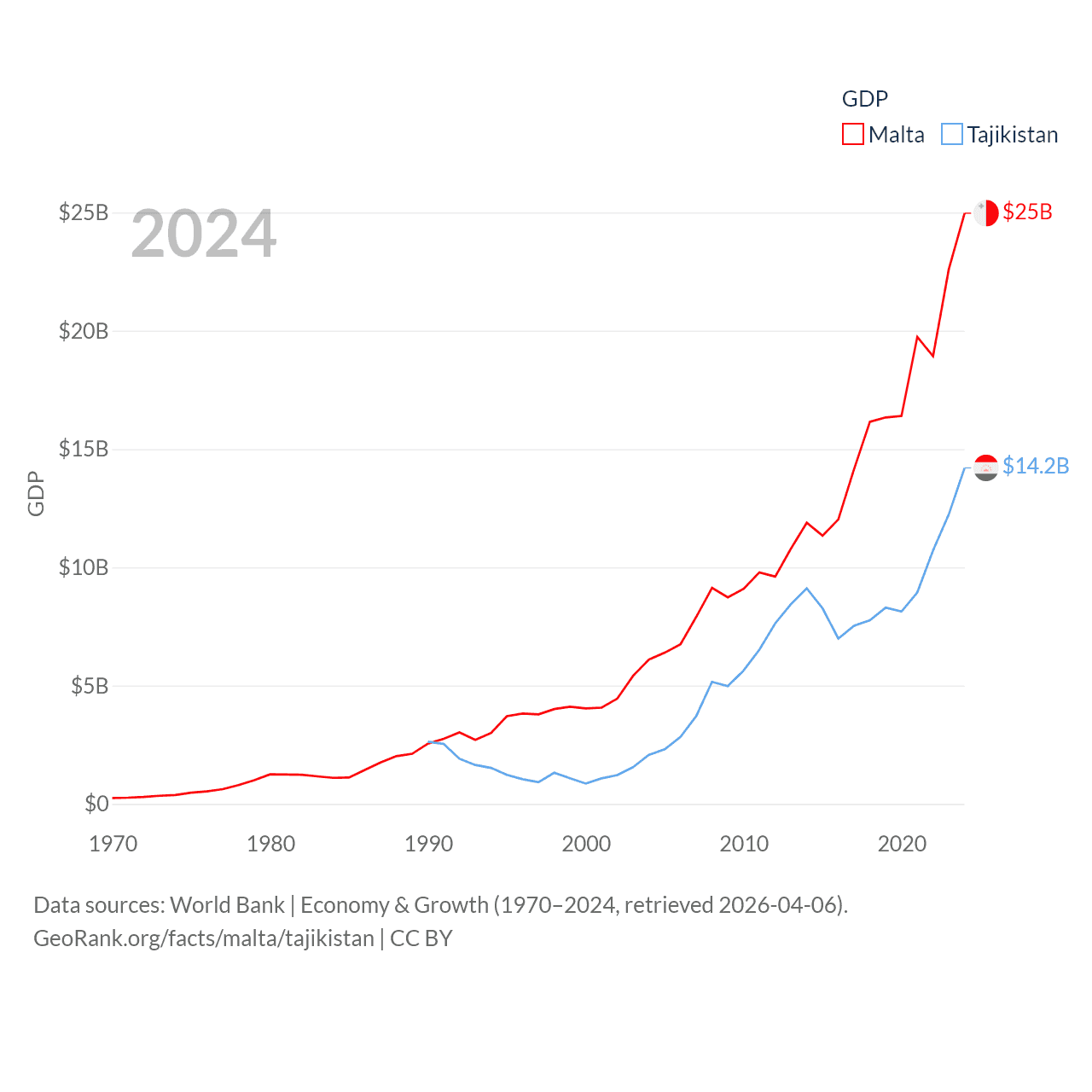 By GDP, Malta ranks 119/197 ($25B) and Tajikistan ranks 145/197 ($14.2B). By GDP per capita, Malta ranks 28/197 ($43,899), while Tajikistan ranks 166/197 ($1,341).