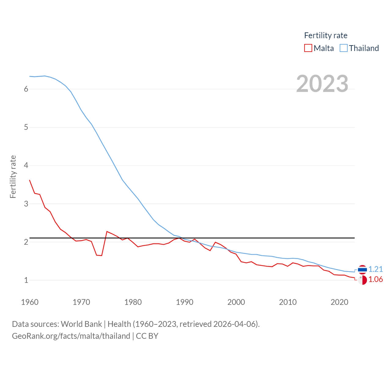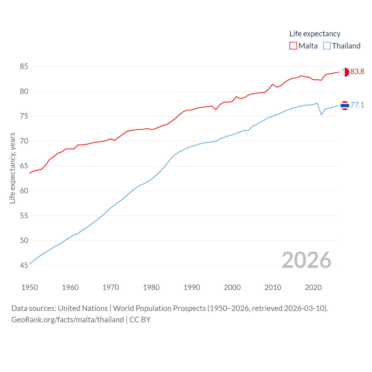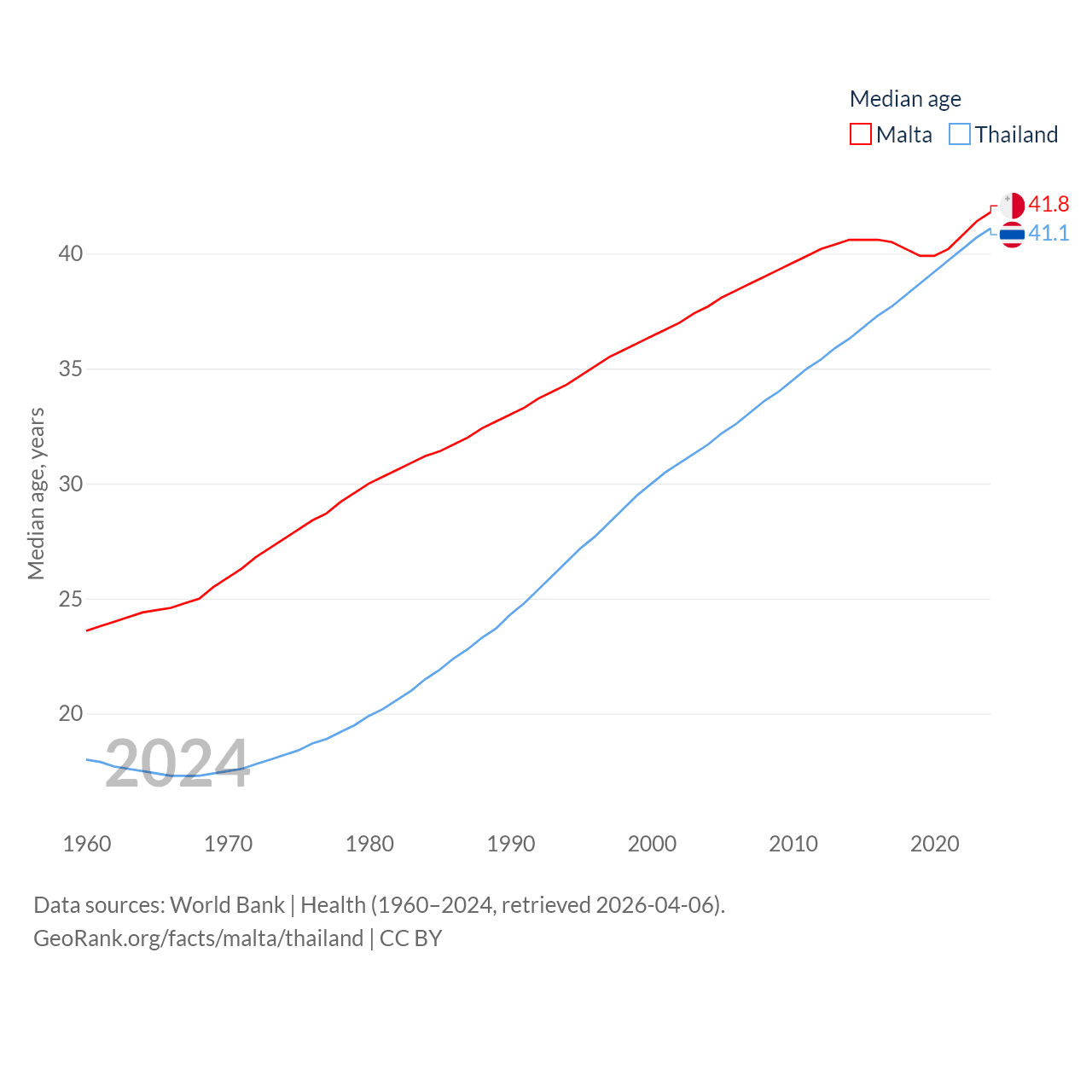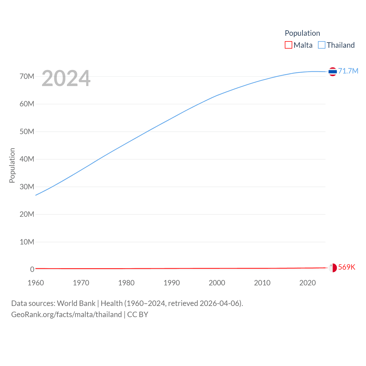 Malta has a population of 569K (ranked 167/197), compared with 71.7M in Thailand (ranked 20/197). Malta's land area is 123.6 sq mi versus 197,256 sq mi for Thailand (ranked 187th vs. 50th).