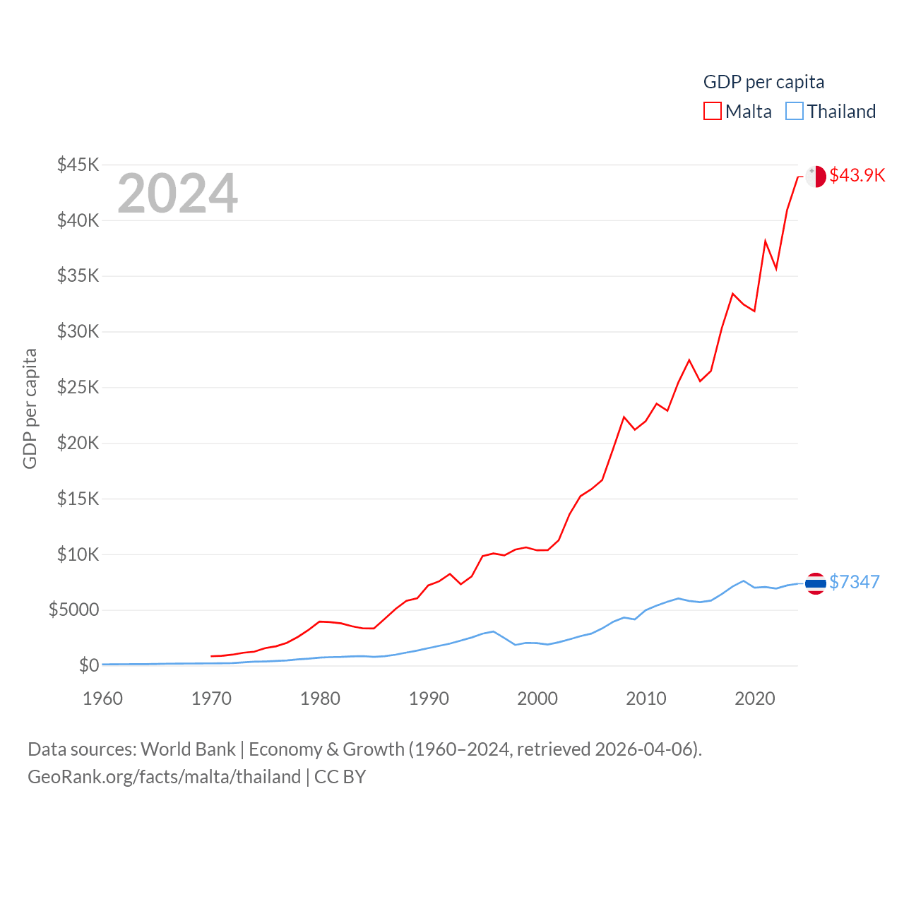 By GDP, Malta ranks 119/197 ($25B) and Thailand ranks 31/197 ($527B). By GDP per capita, Malta ranks 28/197 ($43,899), while Thailand ranks 100/197 ($7,347).