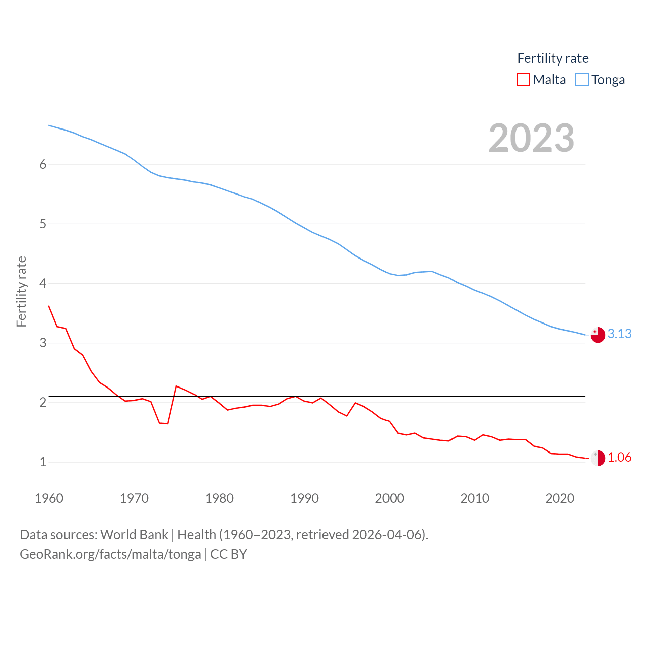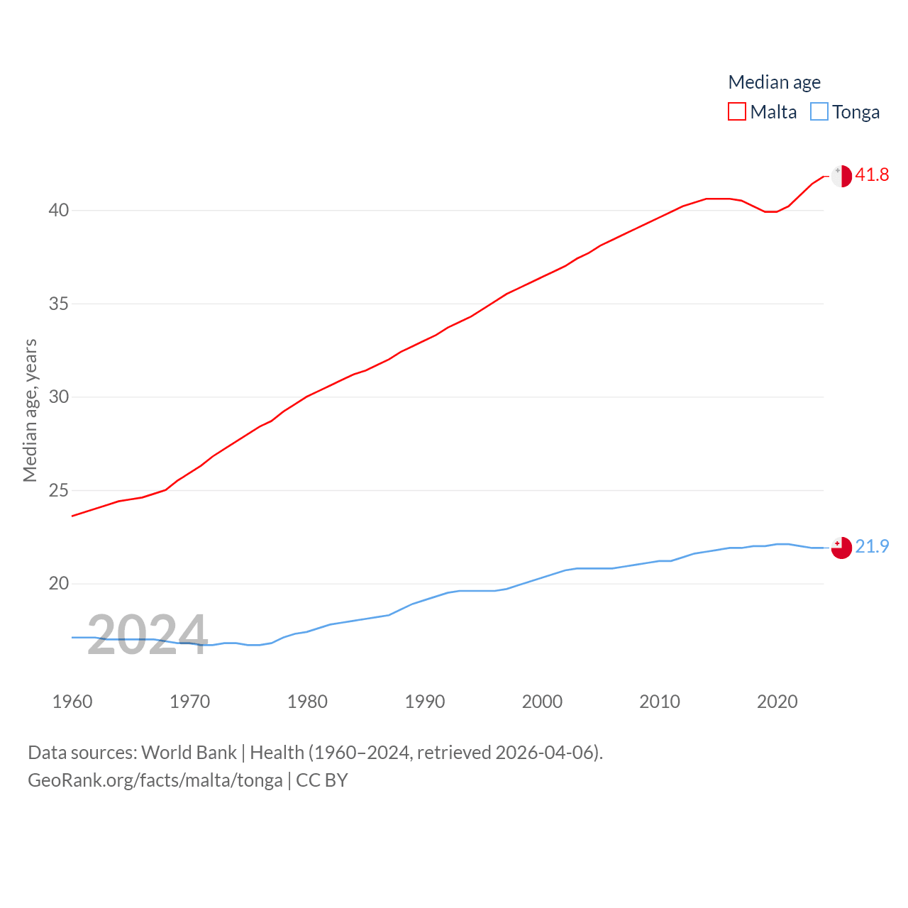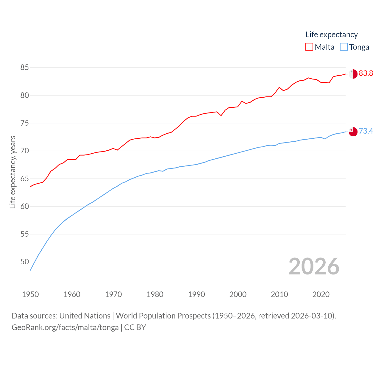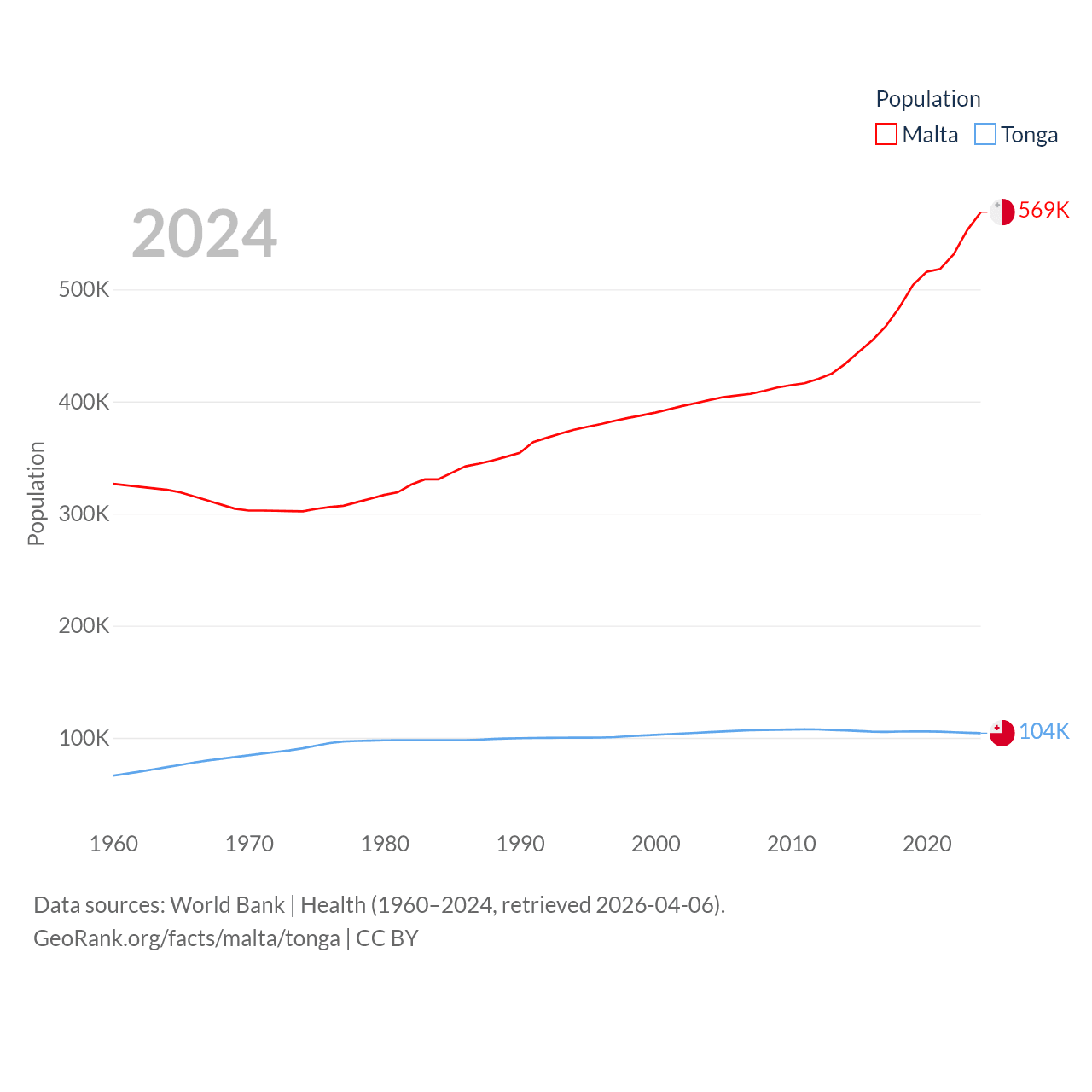 Malta has a population of 569K (ranked 167/197), compared with 104K in Tonga (ranked 183/197). Malta's land area is 123.6 sq mi versus 278 sq mi for Tonga (ranked 187th vs. 176th).