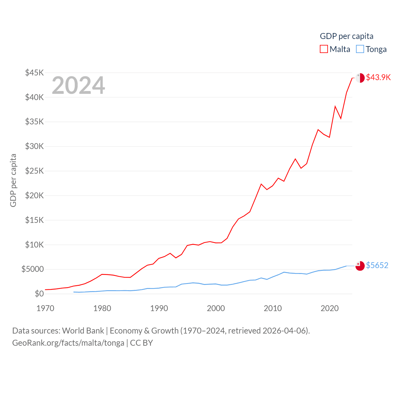 By GDP, Malta ranks 119/197 ($25B) and Tonga ranks 191/197 ($591M). By GDP per capita, Malta ranks 28/197 ($43,899), while Tonga ranks 115/197 ($5,652).