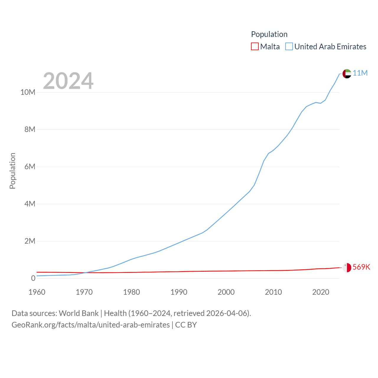 Malta has a population of 569K (ranked 167/197), compared with 11M in The United Arab Emirates (ranked 86/197). Malta's land area is 123.6 sq mi versus 27,421 sq mi for The United Arab Emirates (ranked 187th vs. 117th).