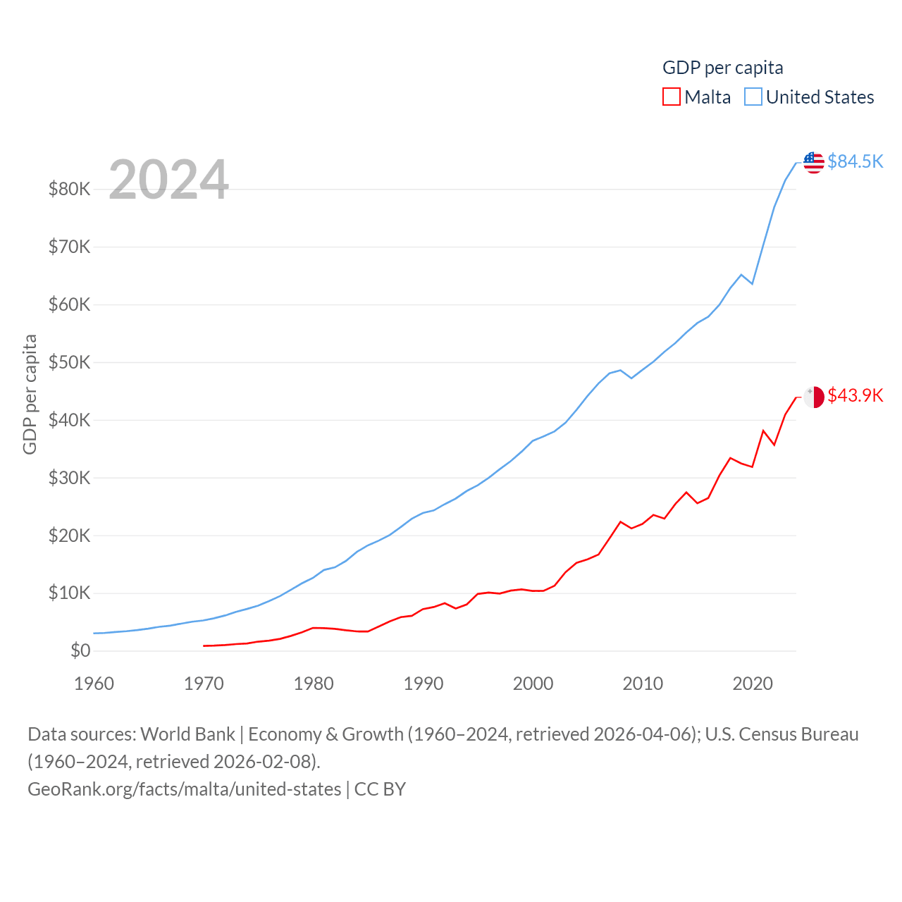 By GDP, Malta ranks 119/197 ($25B) and The United States ranks 1/197 ($28.8T). By GDP per capita, Malta ranks 28/197 ($43,899), while The United States ranks 10/197 ($84,534).