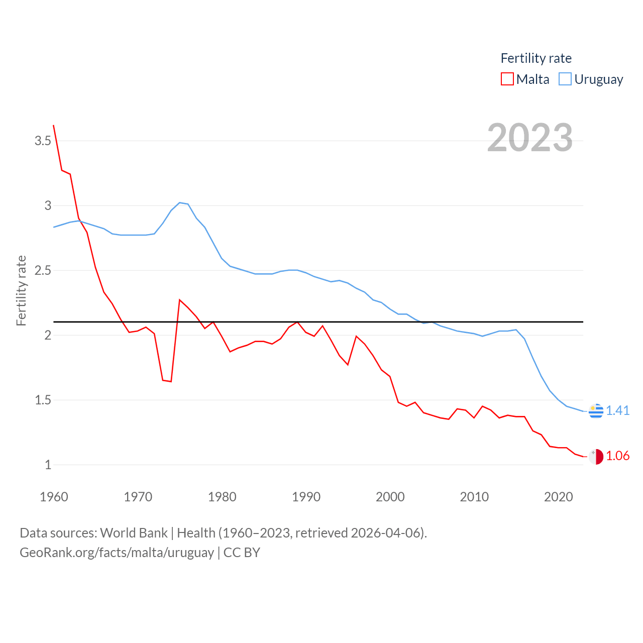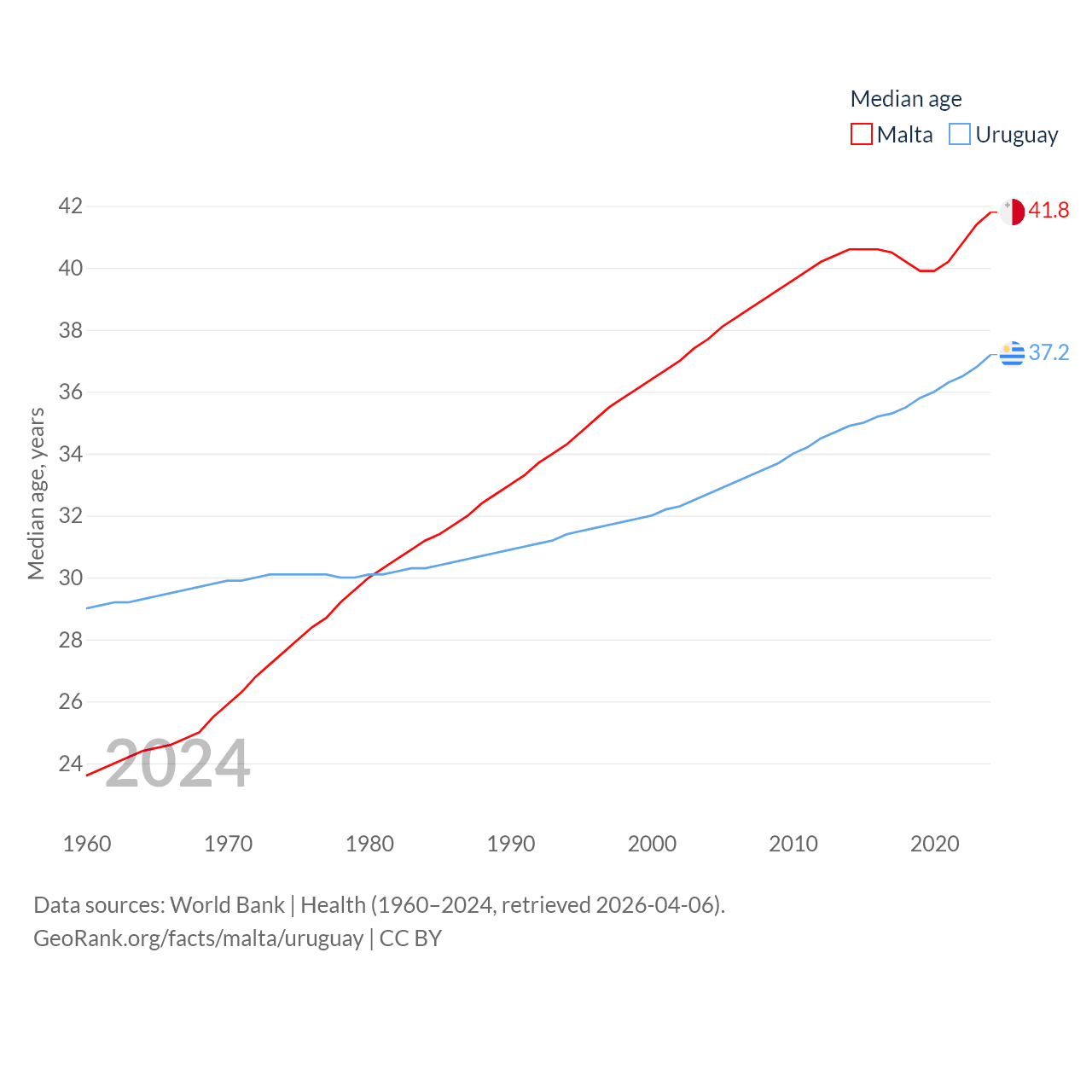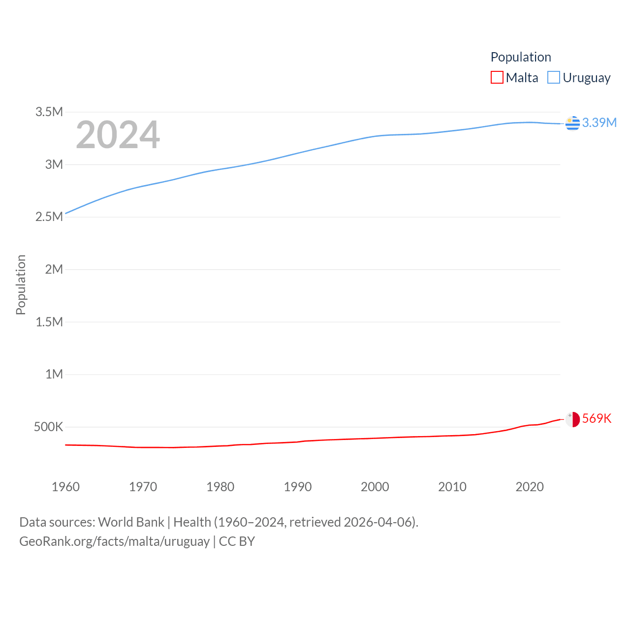 Malta has a population of 569K (ranked 167/197), compared with 3.39M in Uruguay (ranked 133/197). Malta's land area is 123.6 sq mi versus 67,576 sq mi for Uruguay (ranked 187th vs. 89th).