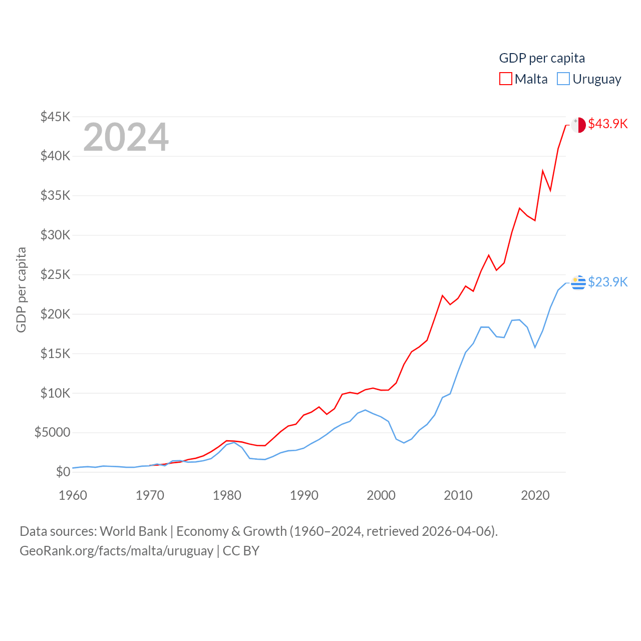 By GDP, Malta ranks 119/197 ($25B) and Uruguay ranks 81/197 ($81B). By GDP per capita, Malta ranks 28/197 ($43,899), while Uruguay ranks 52/197 ($23,907).