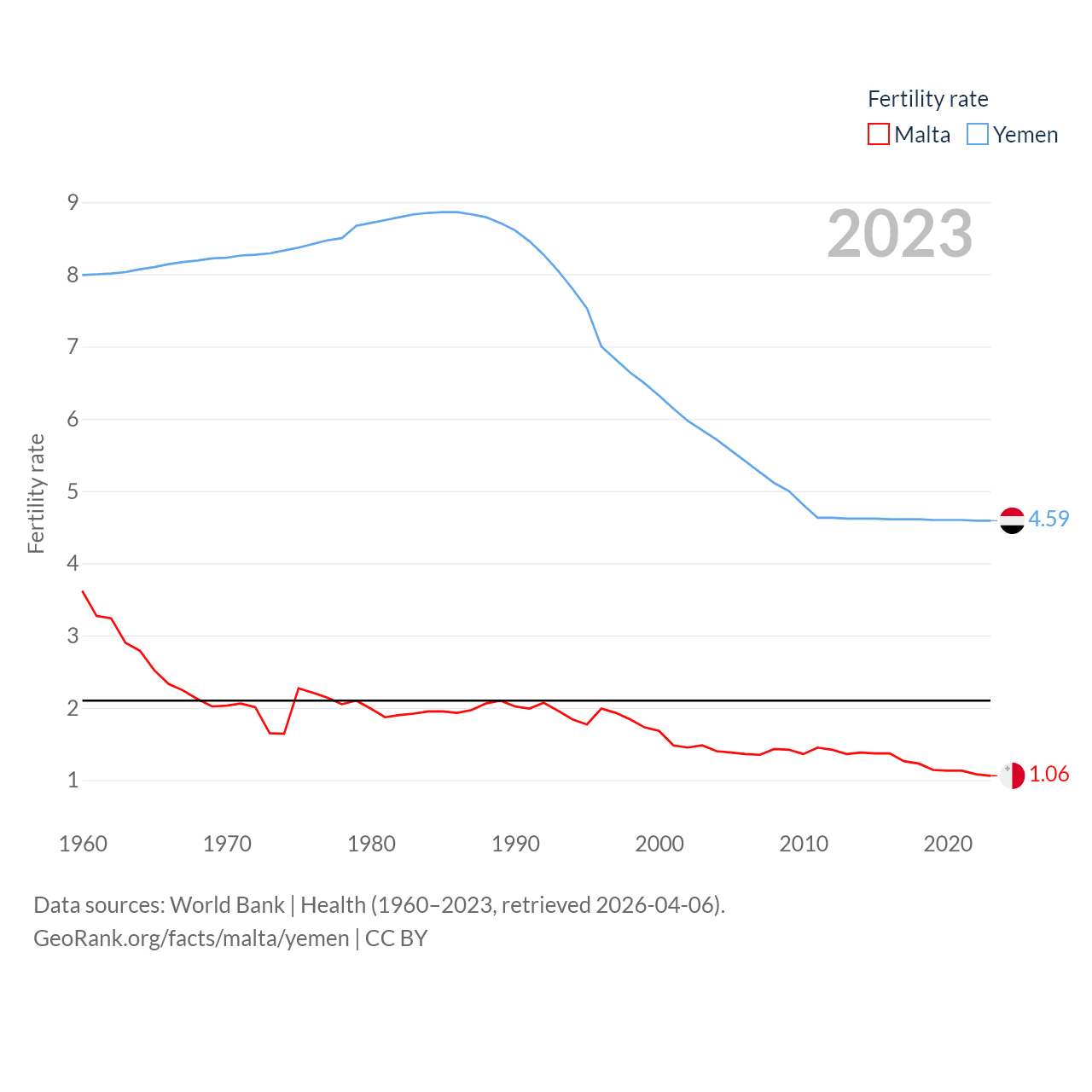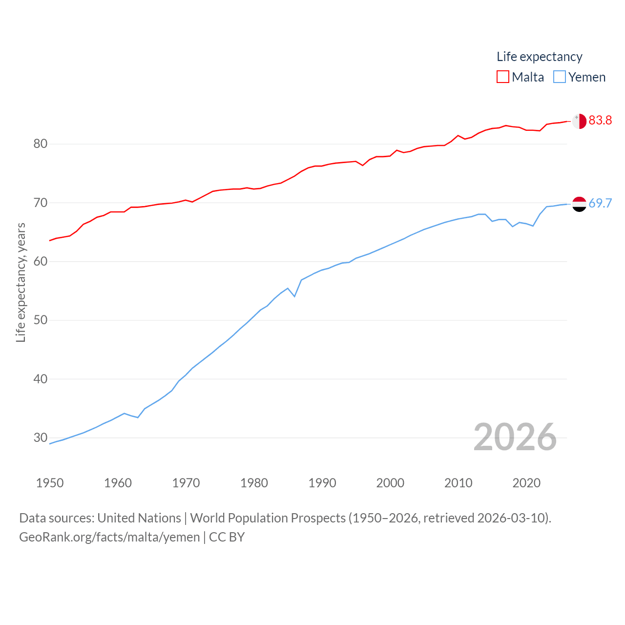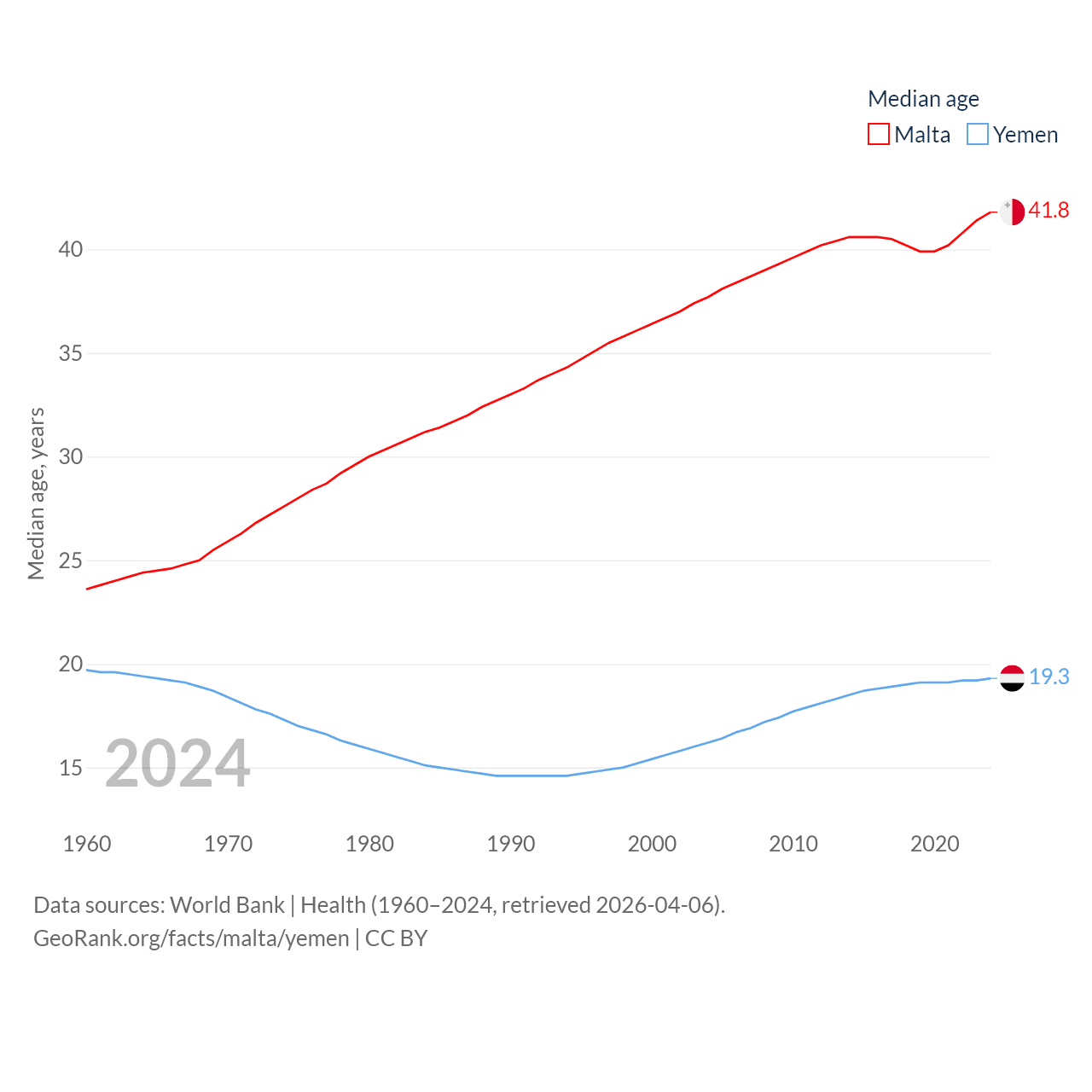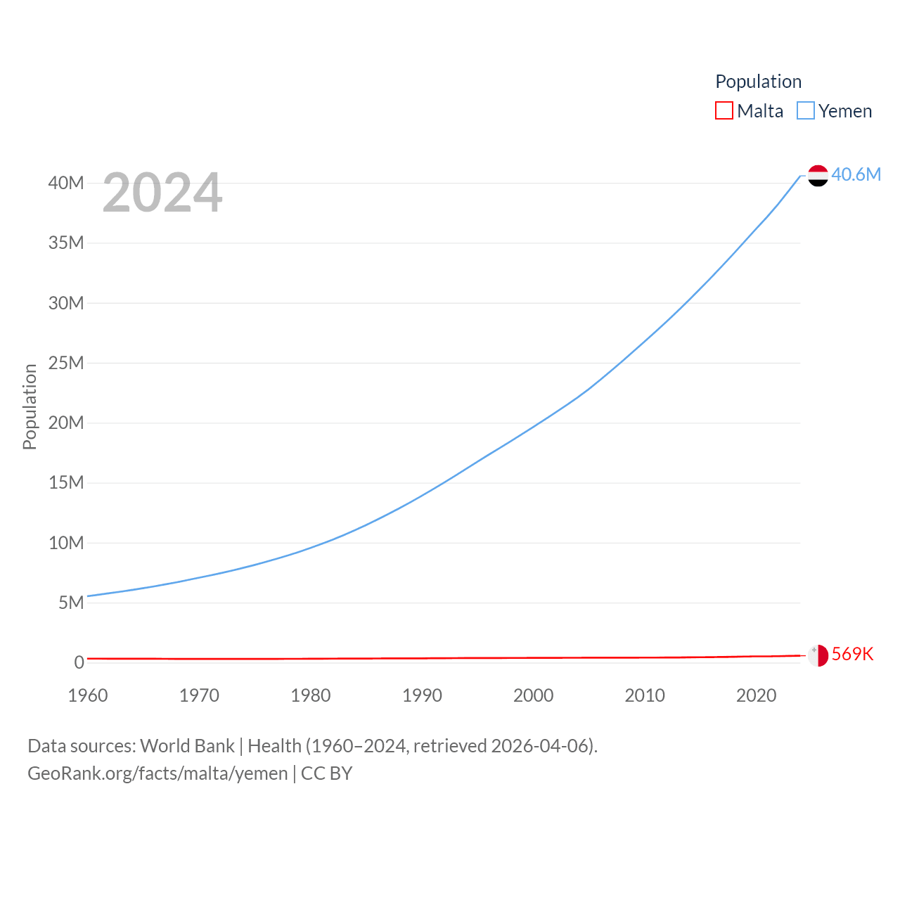 Malta has a population of 569K (ranked 167/197), compared with 40.6M in Yemen (ranked 38/197). Malta's land area is 123.6 sq mi versus 203,850 sq mi for Yemen (ranked 187th vs. 49th).