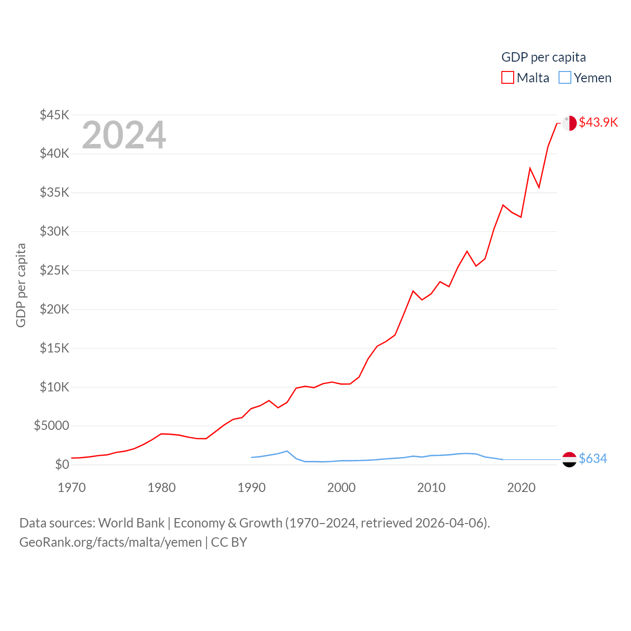 By GDP, Malta ranks 119/197 ($25B) and Yemen ranks 125/197 ($21.6B). By GDP per capita, Malta ranks 28/197 ($43,899), while Yemen ranks 191/197 ($634).