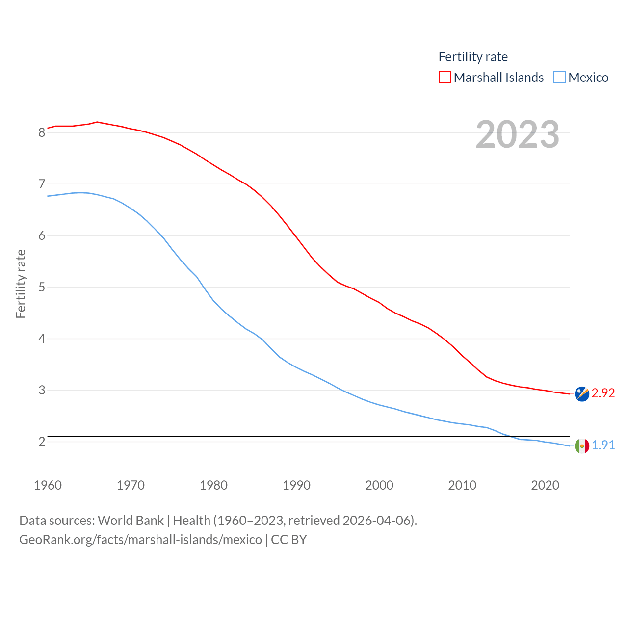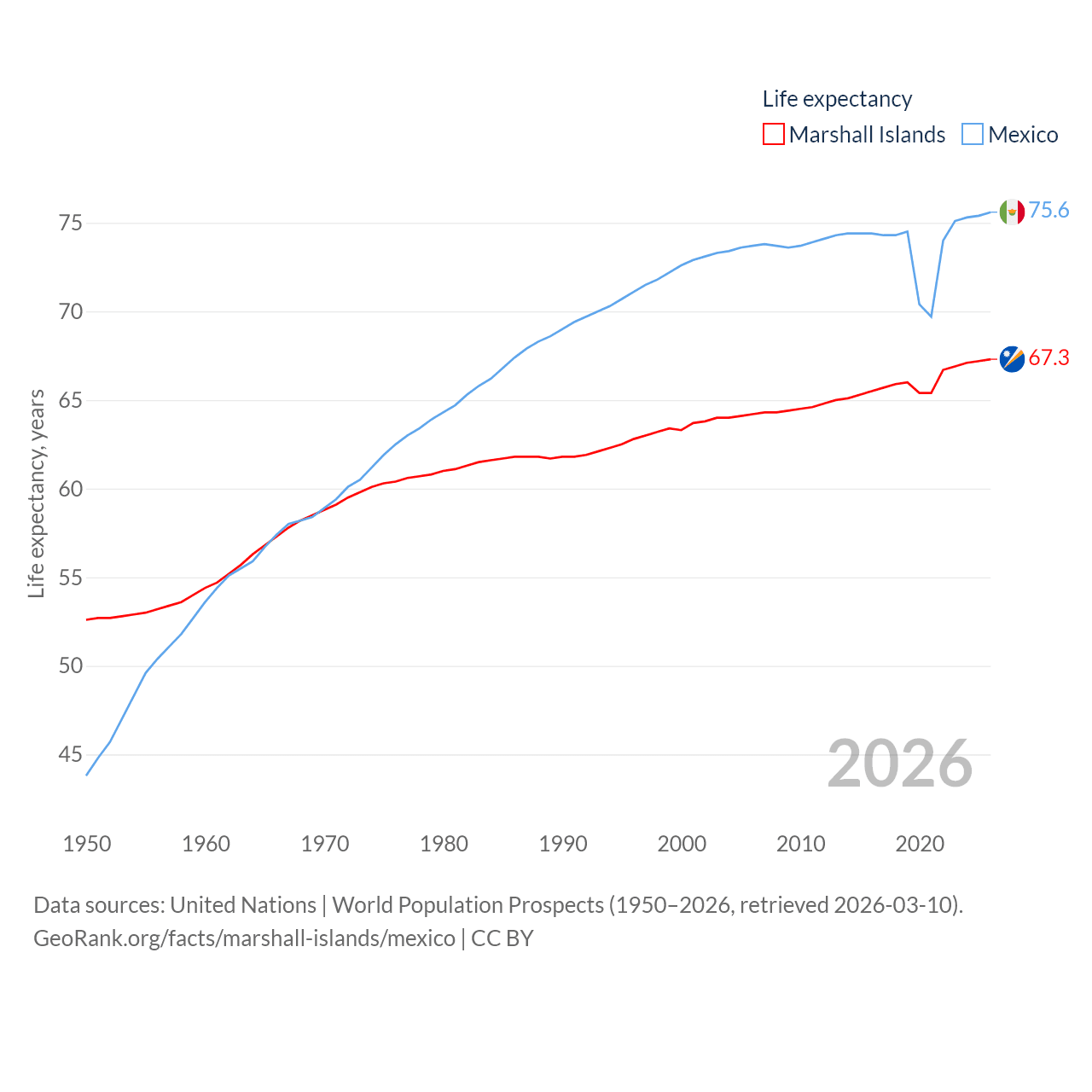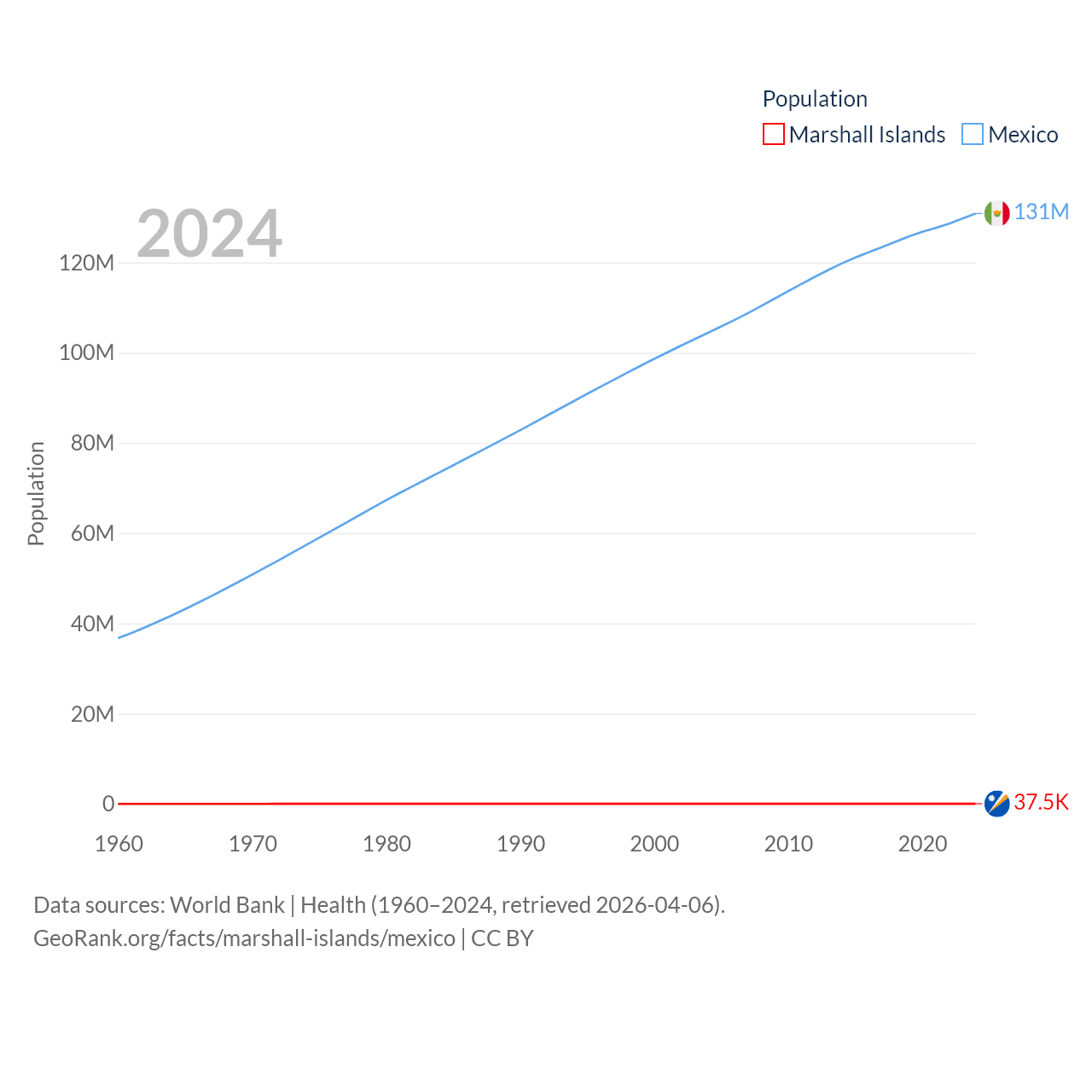 The Marshall Islands has a population of 37.5K (ranked 192/197), compared with 131M in Mexico (ranked 11/197). The Marshall Islands' land area is 69.5 sq mi versus 750,563 sq mi for Mexico (ranked 191st vs. 13th).