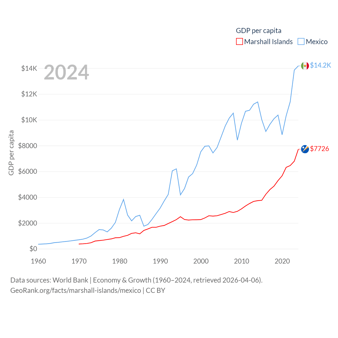 By GDP, The Marshall Islands ranks 193/197 ($290M) and Mexico ranks 13/197 ($1.86T). By GDP per capita, The Marshall Islands ranks 96/197 ($7,726), while Mexico ranks 69/197 ($14,186).