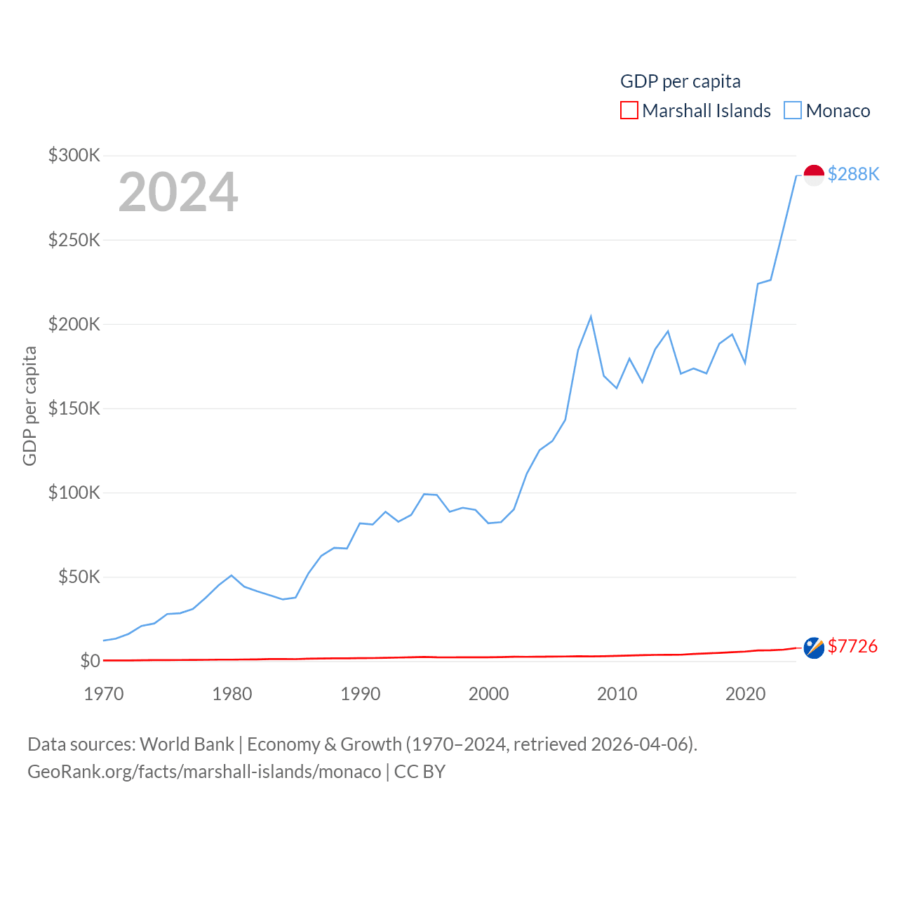 By GDP, The Marshall Islands ranks 193/197 ($290M) and Monaco ranks 152/197 ($11.1B). By GDP per capita, The Marshall Islands ranks 96/197 ($7,726), while Monaco ranks 1/197 ($288,001).