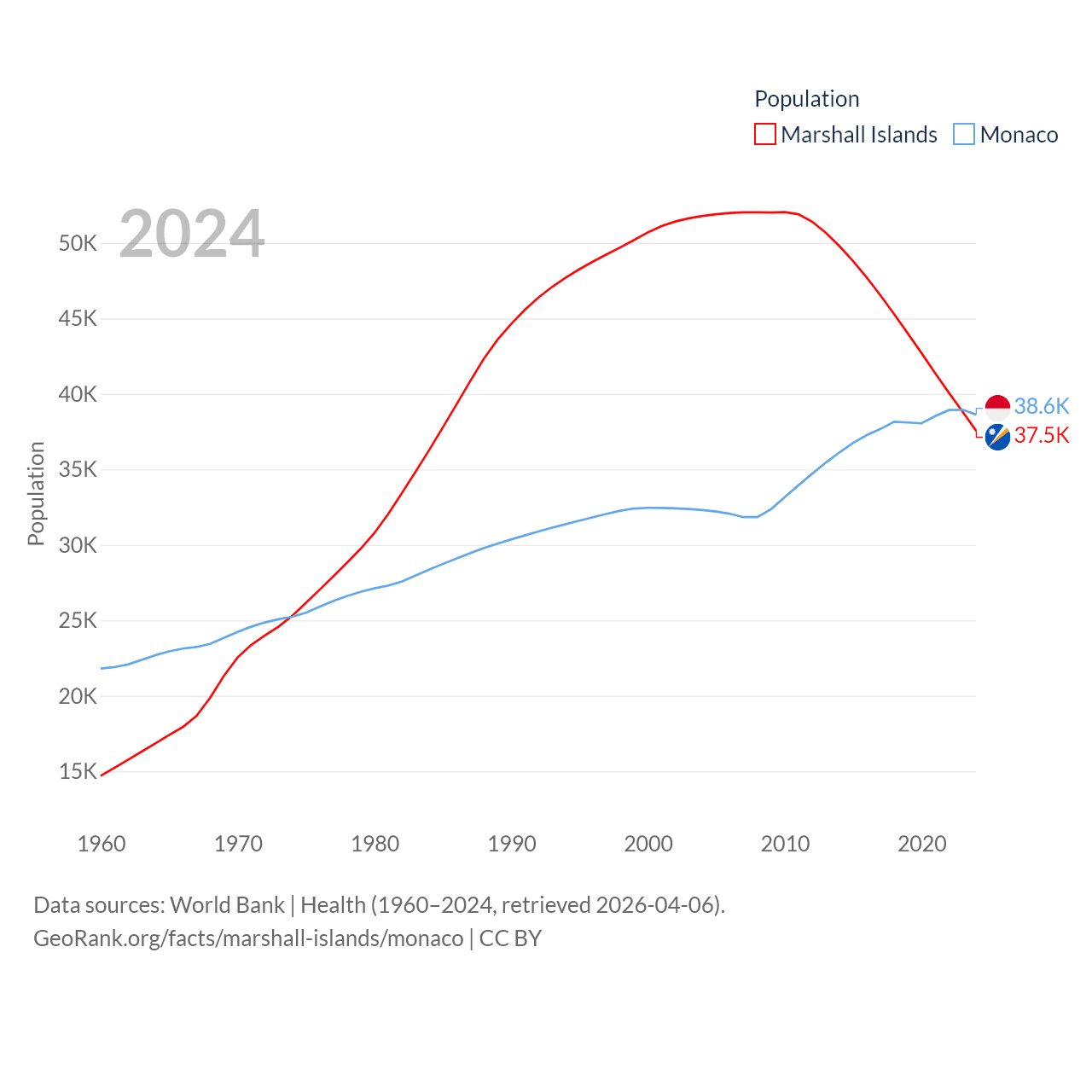 The Marshall Islands has a population of 37.5K (ranked 192/197), compared with 38.6K in Monaco (ranked 191/197). The Marshall Islands' land area is 69.5 sq mi versus 0.8 sq mi for Monaco (ranked 191st vs. 196th).