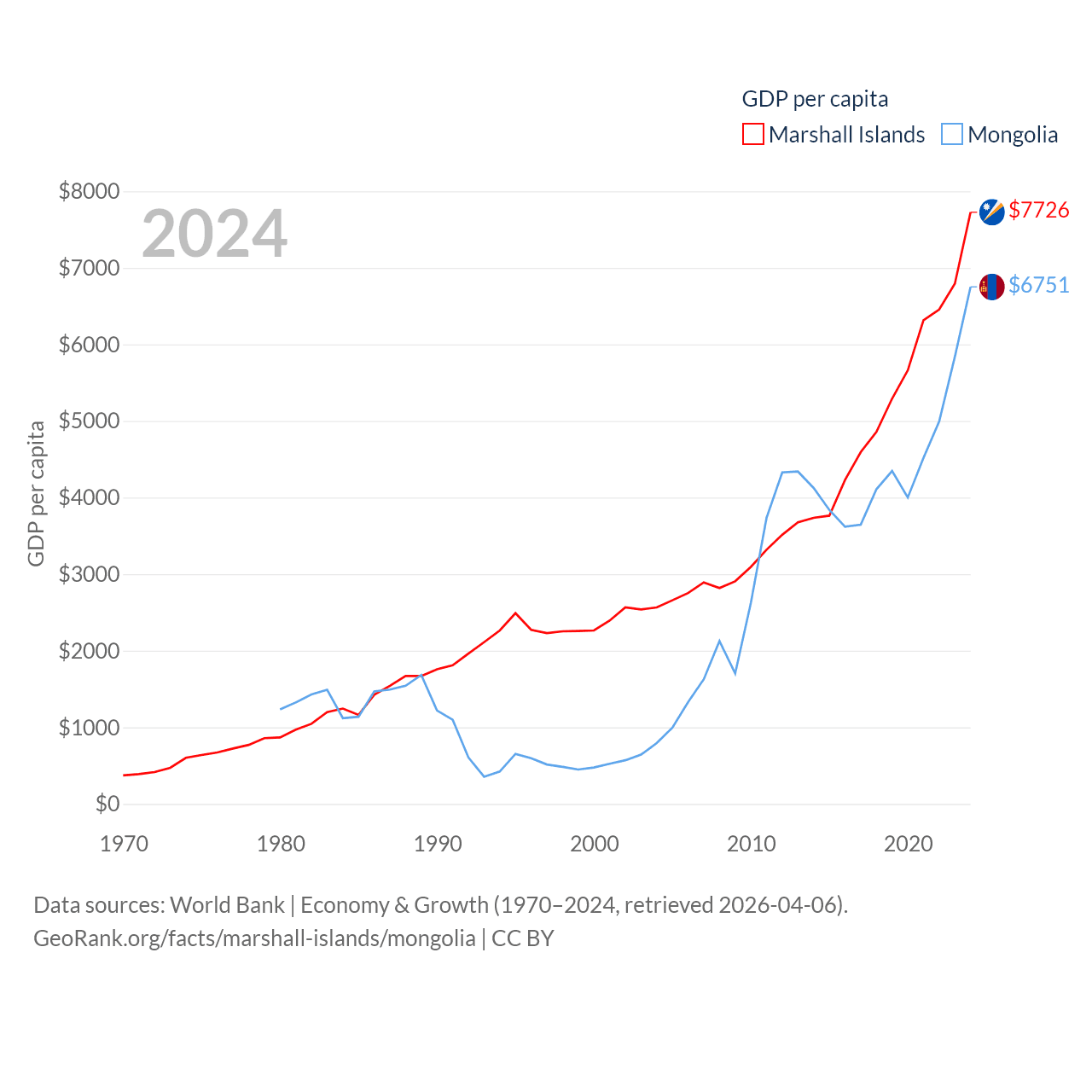By GDP, The Marshall Islands ranks 193/197 ($290M) and Mongolia ranks 121/197 ($23.8B). By GDP per capita, The Marshall Islands ranks 96/197 ($7,726), while Mongolia ranks 105/197 ($6,751).
