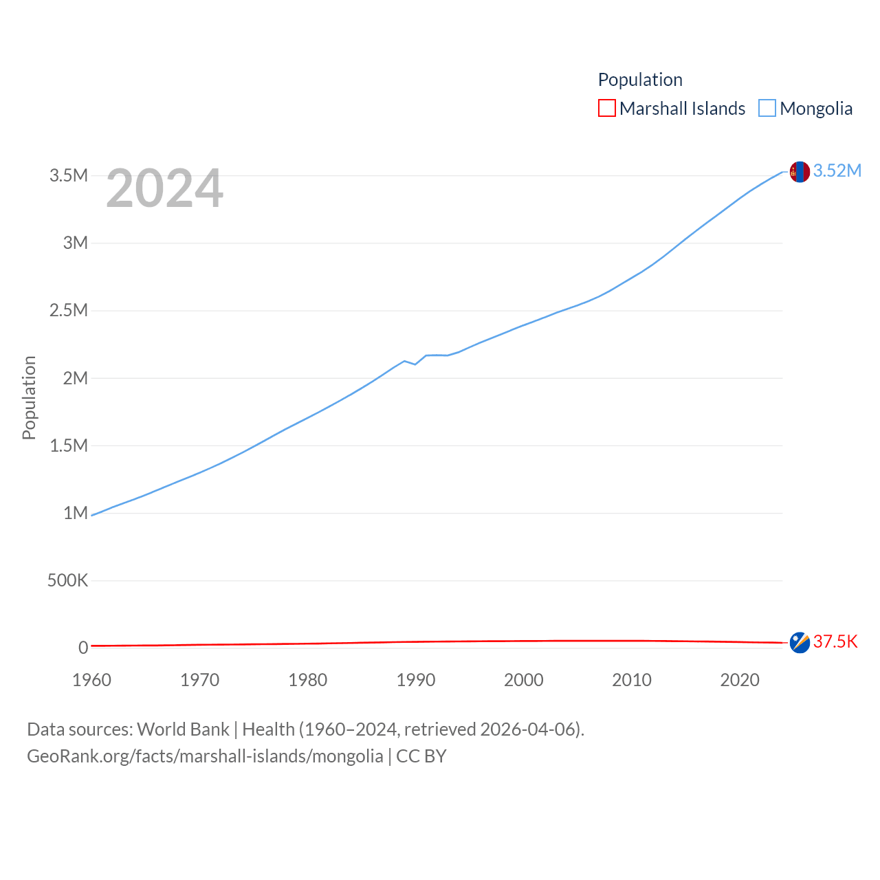 The Marshall Islands has a population of 37.5K (ranked 192/197), compared with 3.52M in Mongolia (ranked 132/197). The Marshall Islands' land area is 69.5 sq mi versus 601,740 sq mi for Mongolia (ranked 191st vs. 18th).