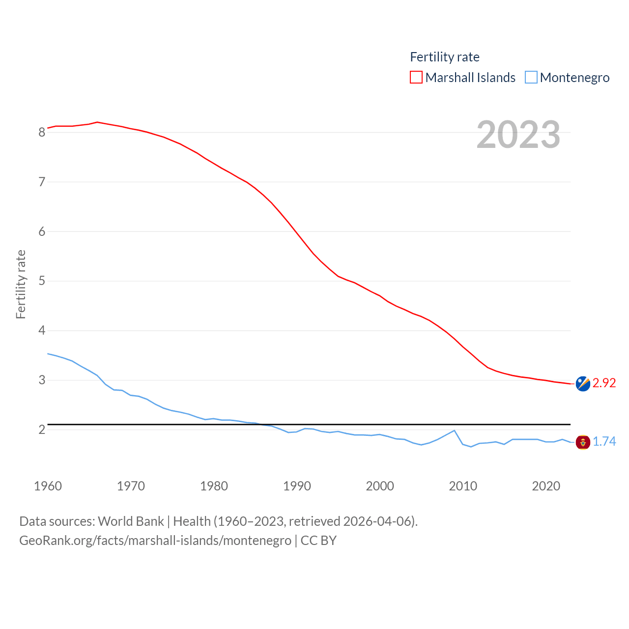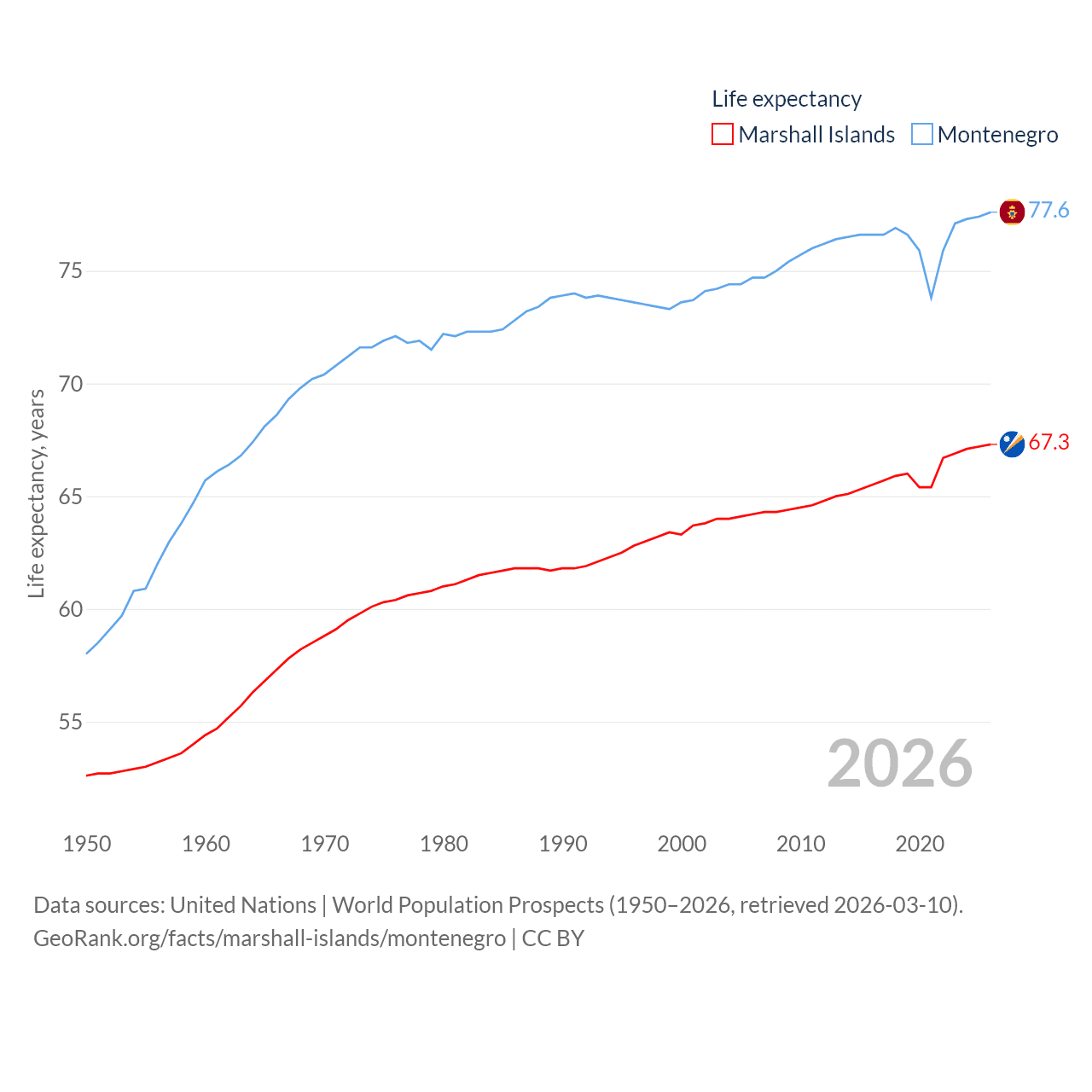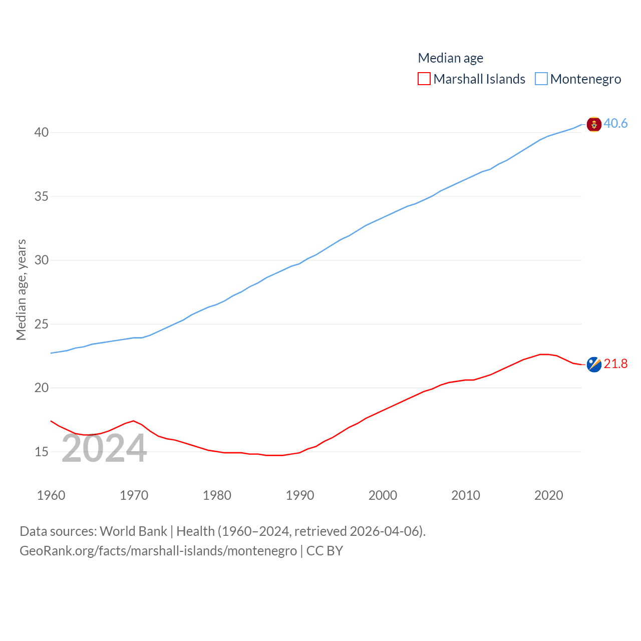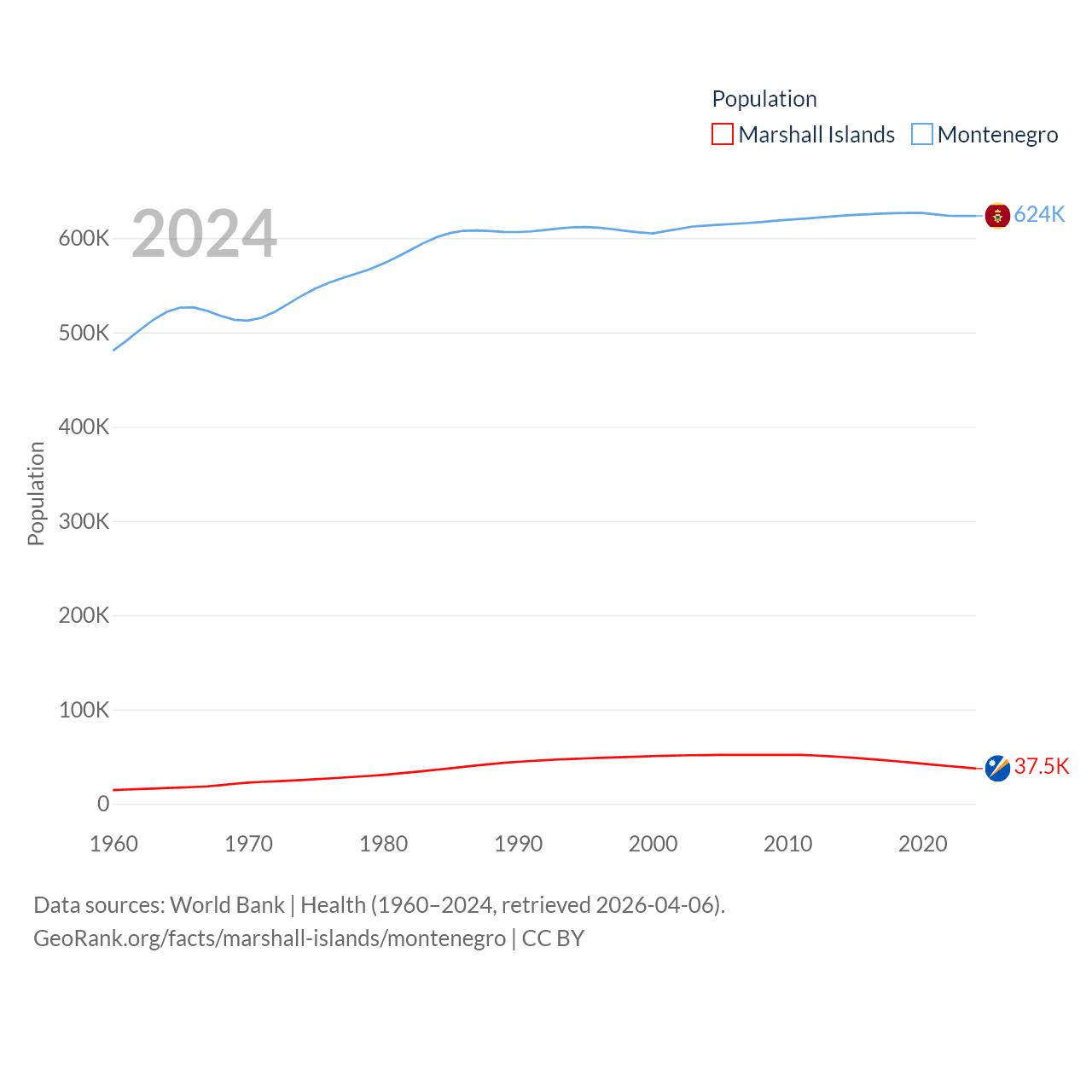 The Marshall Islands has a population of 37.5K (ranked 192/197), compared with 624K in Montenegro (ranked 166/197). The Marshall Islands' land area is 69.5 sq mi versus 5,193 sq mi for Montenegro (ranked 191st vs. 156th).