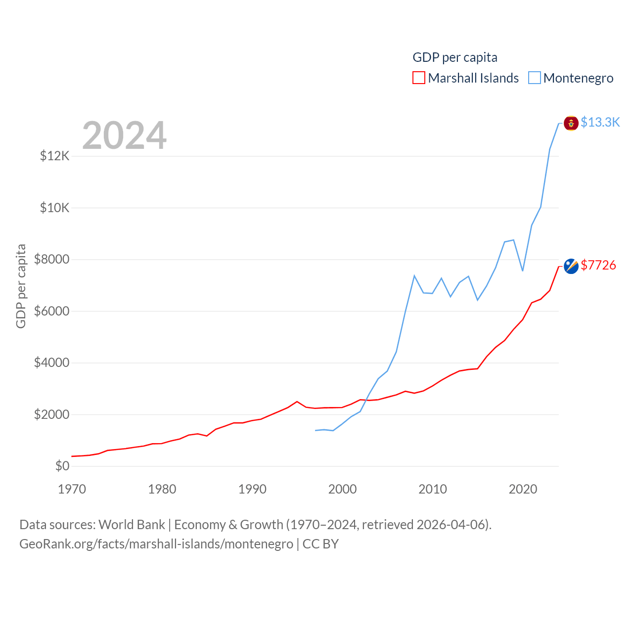By GDP, The Marshall Islands ranks 193/197 ($290M) and Montenegro ranks 155/197 ($8.27B). By GDP per capita, The Marshall Islands ranks 96/197 ($7,726), while Montenegro ranks 77/197 ($13,263).