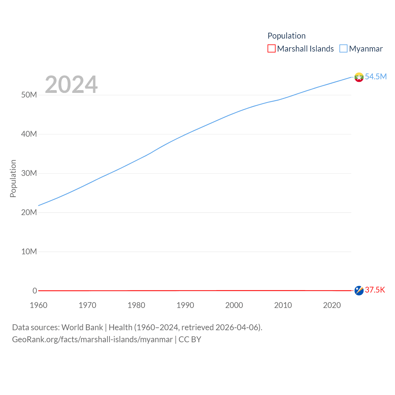 The Marshall Islands has a population of 37.5K (ranked 192/197), compared with 54.5M in Myanmar (ranked 27/197). The Marshall Islands' land area is 69.5 sq mi versus 251,997 sq mi for Myanmar (ranked 191st vs. 39th).