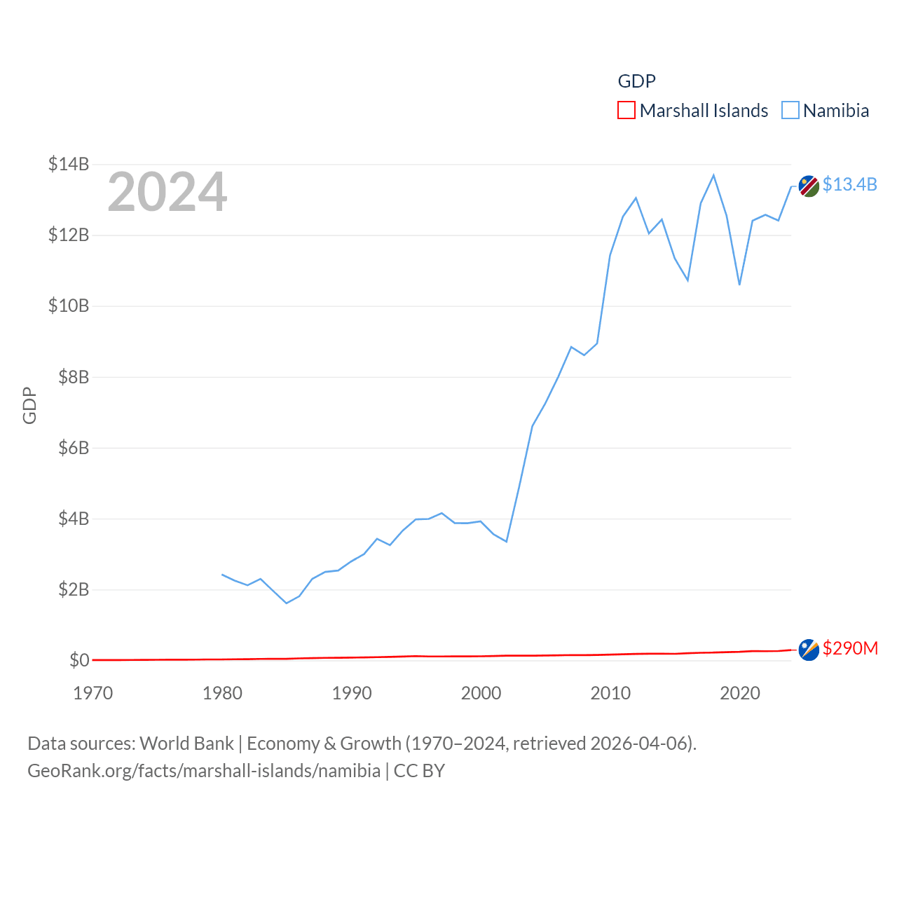 By GDP, The Marshall Islands ranks 193/197 ($290M) and Namibia ranks 147/197 ($13.4B). By GDP per capita, The Marshall Islands ranks 96/197 ($7,726), while Namibia ranks 126/197 ($4,413).