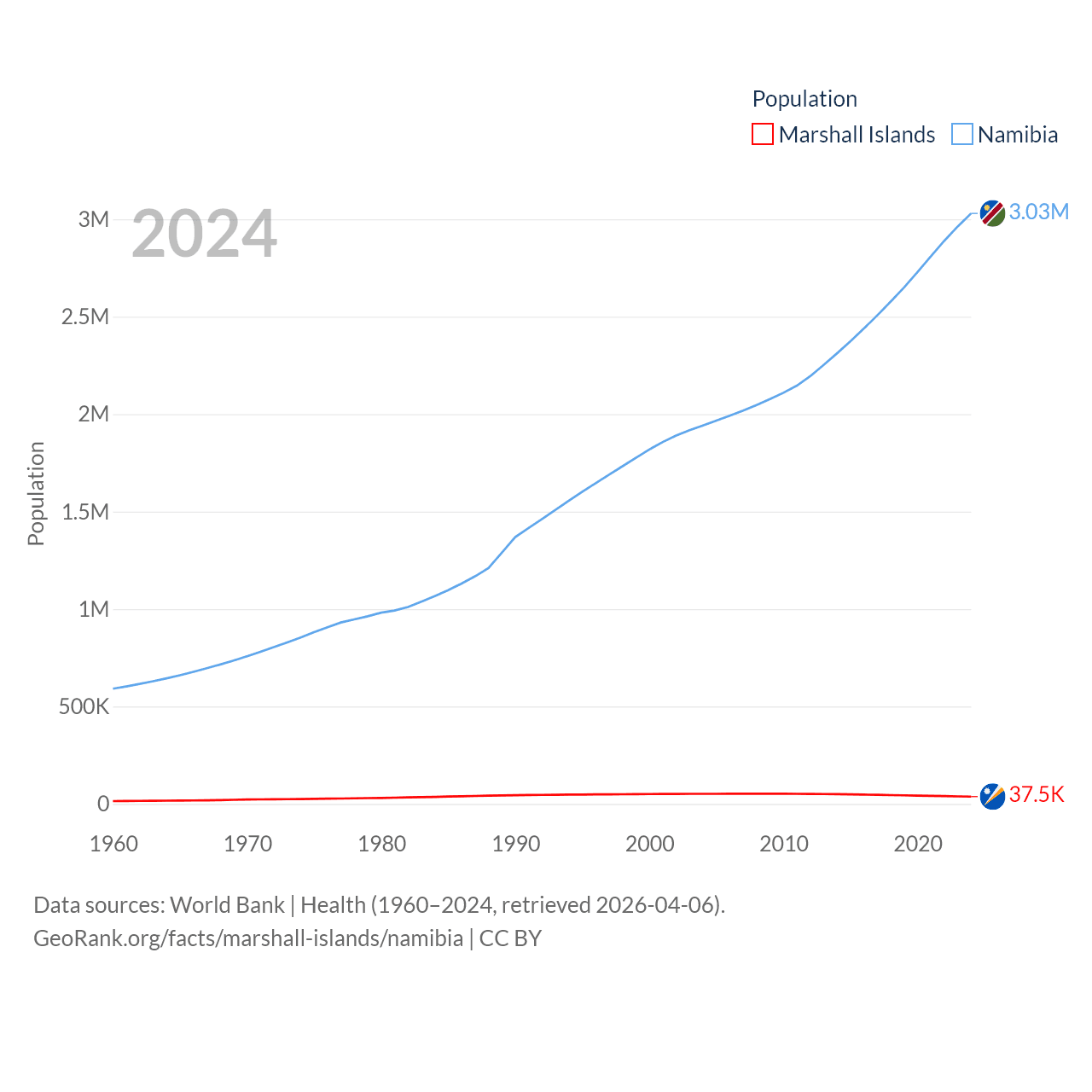 The Marshall Islands has a population of 37.5K (ranked 192/197), compared with 3.03M in Namibia (ranked 136/197). The Marshall Islands' land area is 69.5 sq mi versus 317,874 sq mi for Namibia (ranked 191st vs. 33rd).