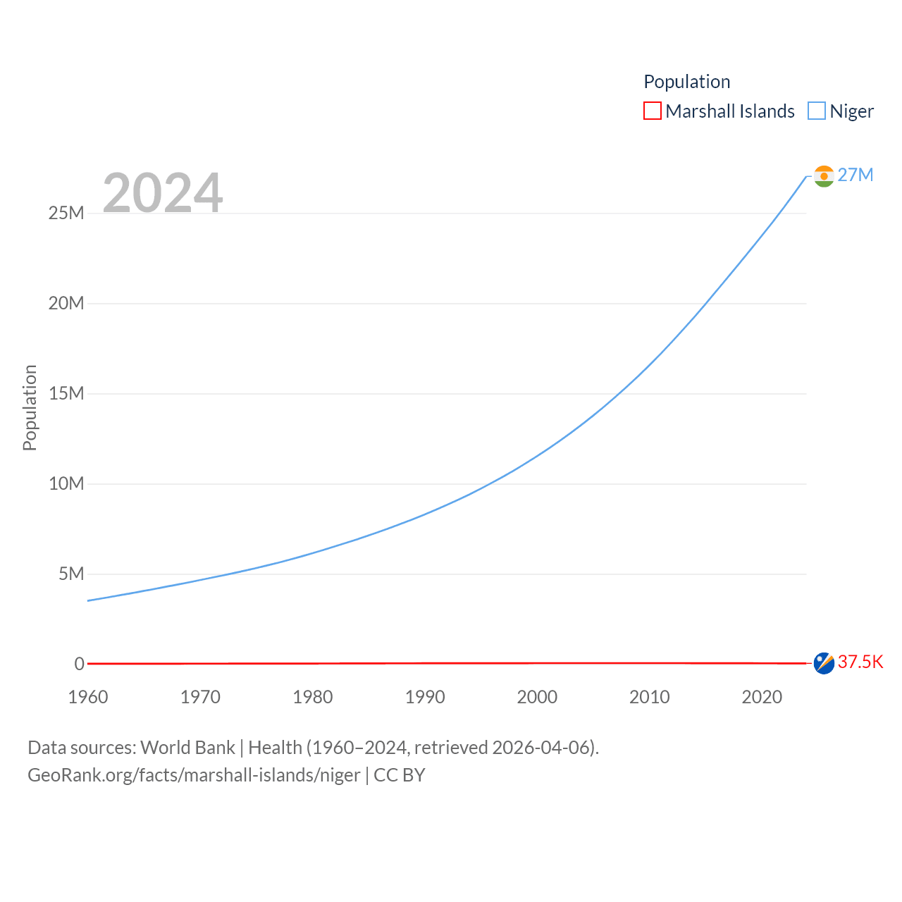 The Marshall Islands has a population of 37.5K (ranked 192/197), compared with 27M in Niger (ranked 55/197). The Marshall Islands' land area is 69.5 sq mi versus 489,076 sq mi for Niger (ranked 191st vs. 20th).