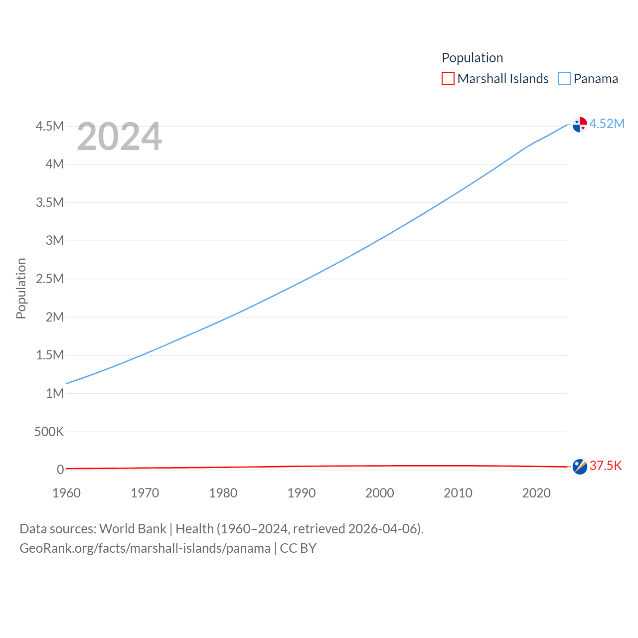 The Marshall Islands has a population of 37.5K (ranked 192/197), compared with 4.52M in Panama (ranked 128/197). The Marshall Islands' land area is 69.5 sq mi versus 28,641 sq mi for Panama (ranked 191st vs. 115th).