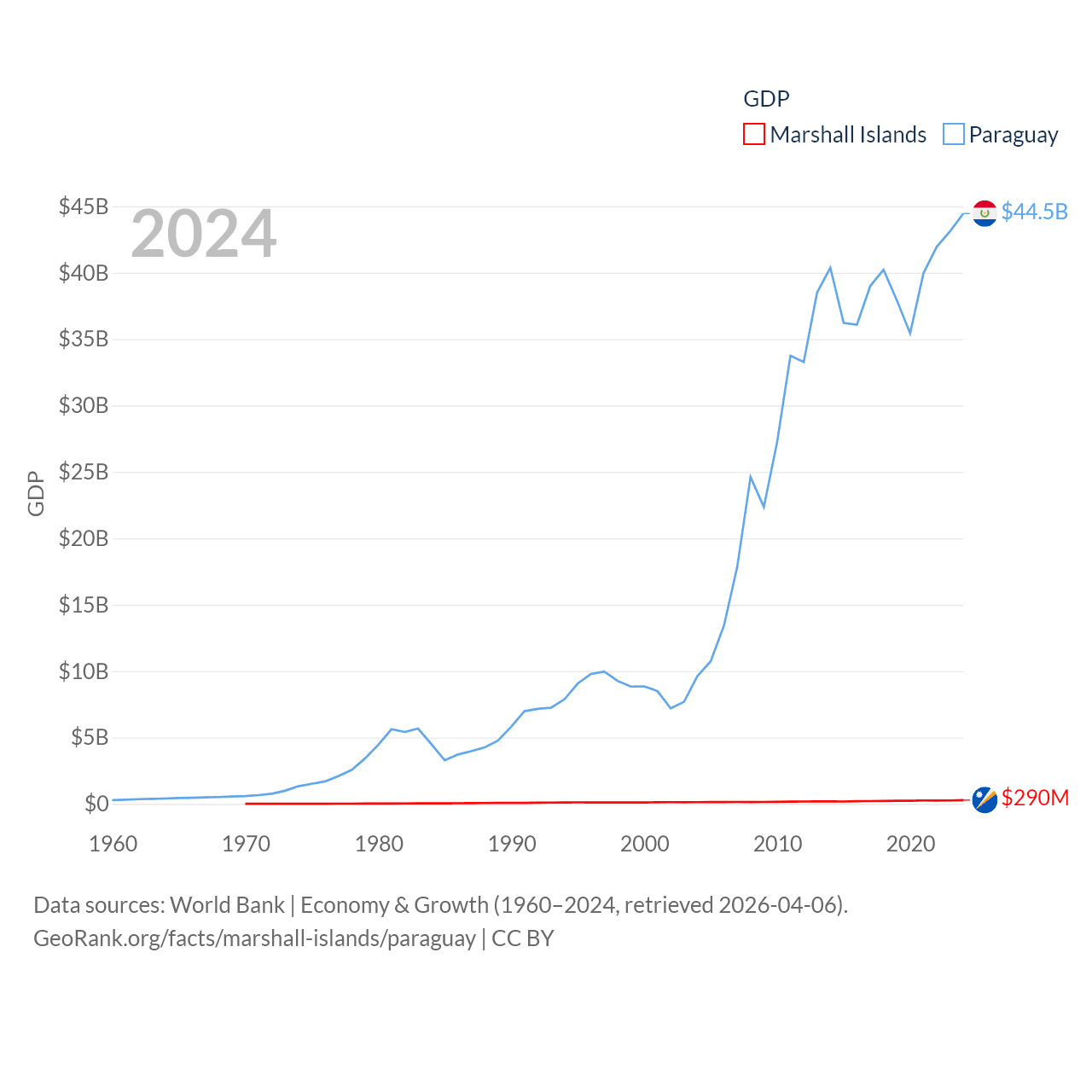 By GDP, The Marshall Islands ranks 193/197 ($290M) and Paraguay ranks 98/197 ($44.5B). By GDP per capita, The Marshall Islands ranks 96/197 ($7,726), while Paraguay ranks 109/197 ($6,416).