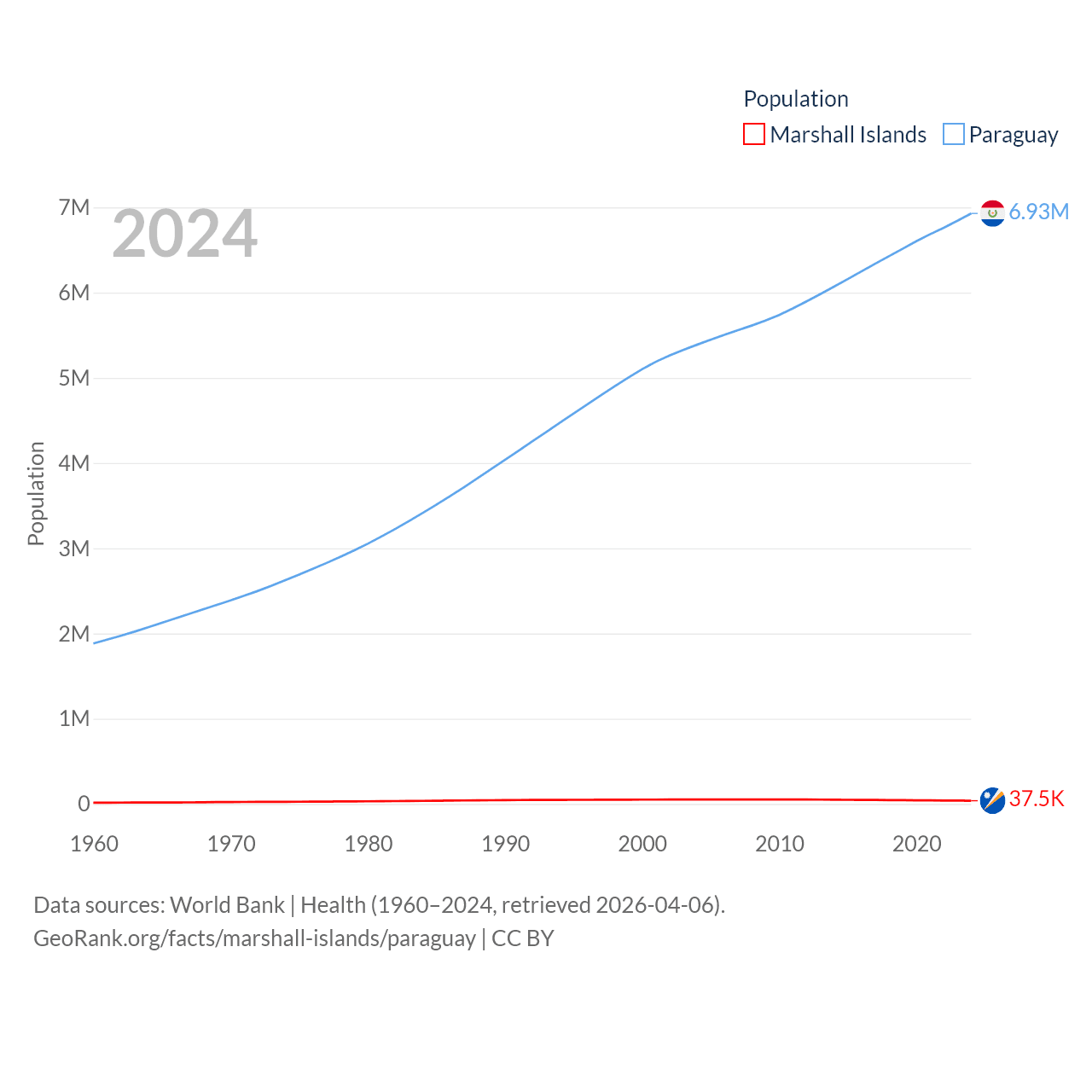 The Marshall Islands has a population of 37.5K (ranked 192/197), compared with 6.93M in Paraguay (ranked 107/197). The Marshall Islands' land area is 69.5 sq mi versus 152,901 sq mi for Paraguay (ranked 191st vs. 59th).