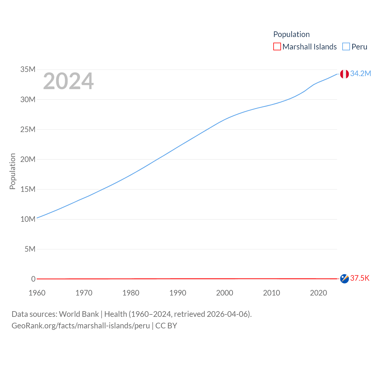 The Marshall Islands has a population of 37.5K (ranked 192/197), compared with 34.2M in Peru (ranked 48/197). The Marshall Islands' land area is 69.5 sq mi versus 494,211 sq mi for Peru (ranked 191st vs. 19th).