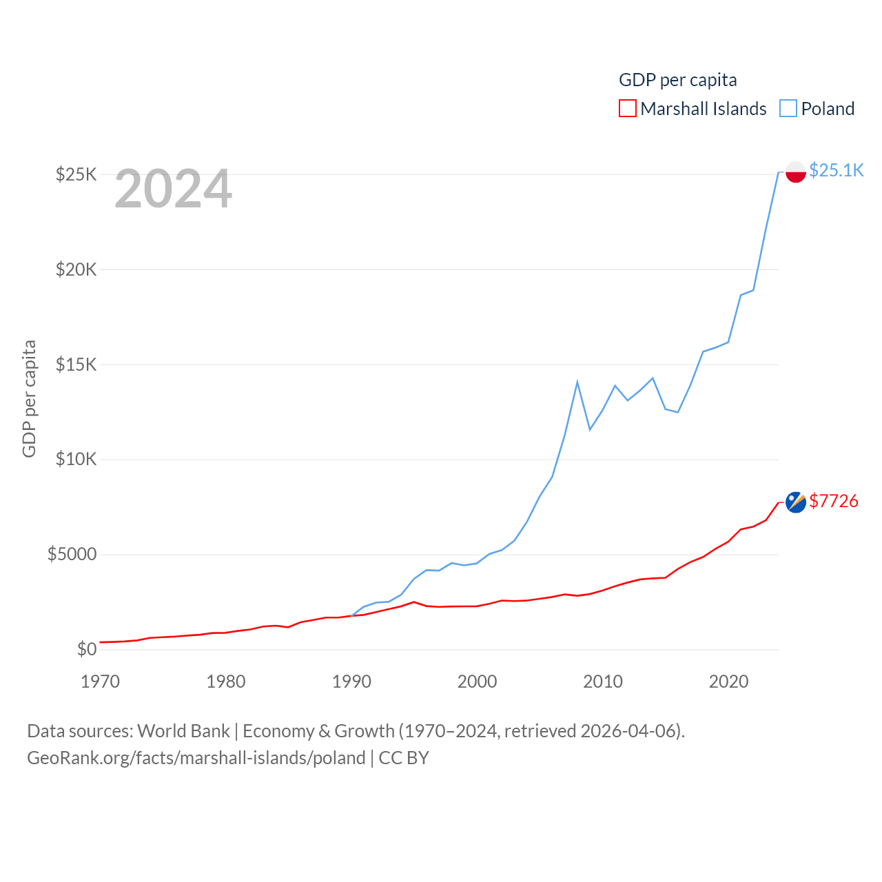 By GDP, The Marshall Islands ranks 193/197 ($290M) and Poland ranks 21/197 ($918B). By GDP per capita, The Marshall Islands ranks 96/197 ($7,726), while Poland ranks 48/197 ($25,104).