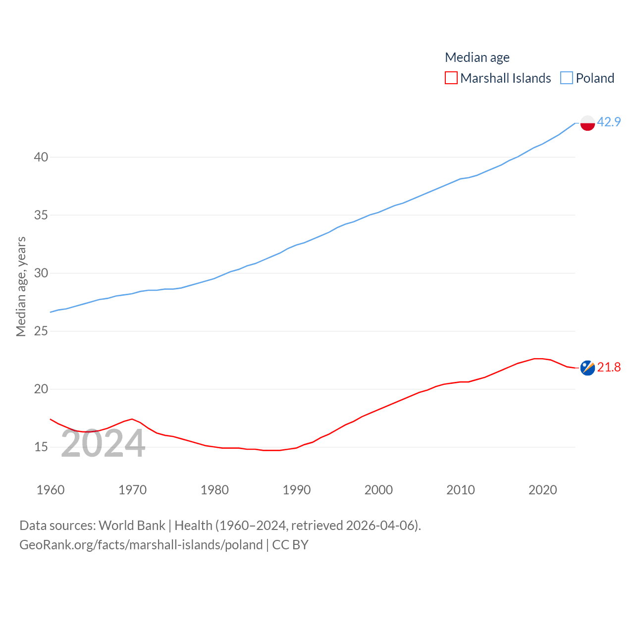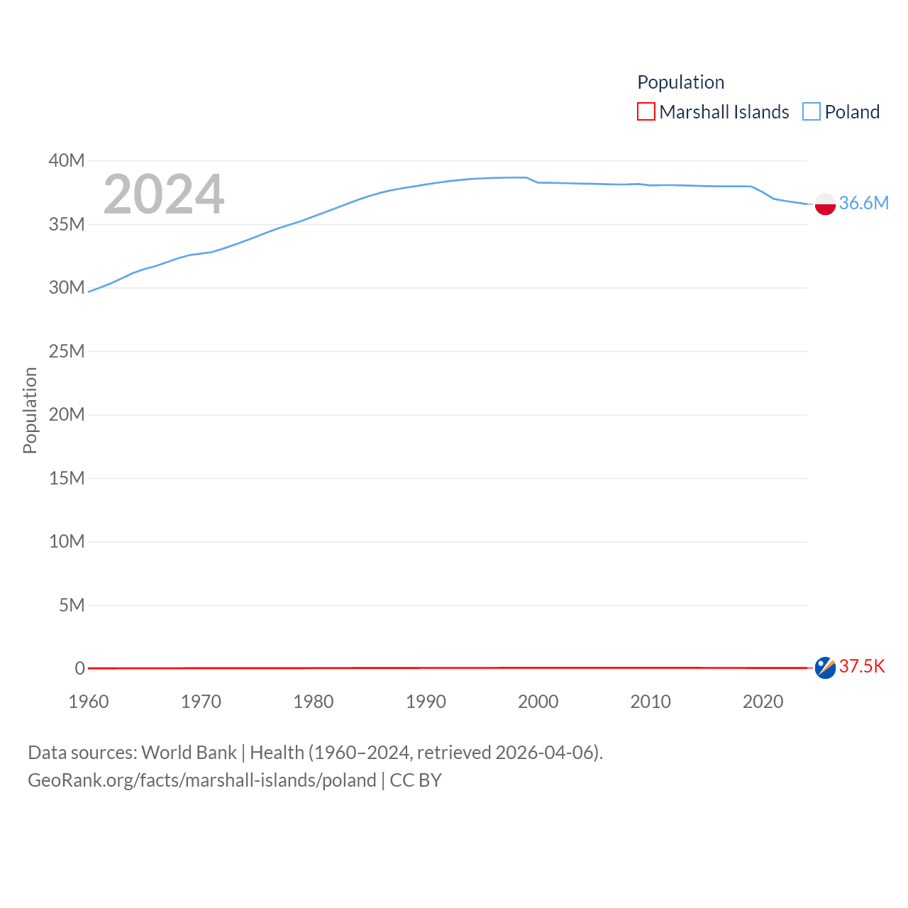 The Marshall Islands has a population of 37.5K (ranked 192/197), compared with 36.6M in Poland (ranked 42/197). The Marshall Islands' land area is 69.5 sq mi versus 118,252 sq mi for Poland (ranked 191st vs. 69th).