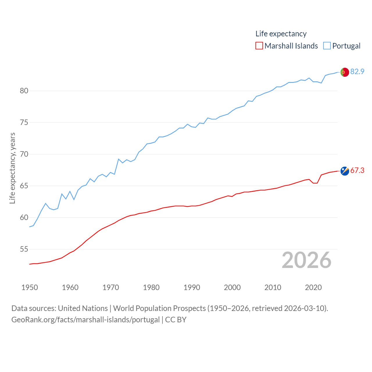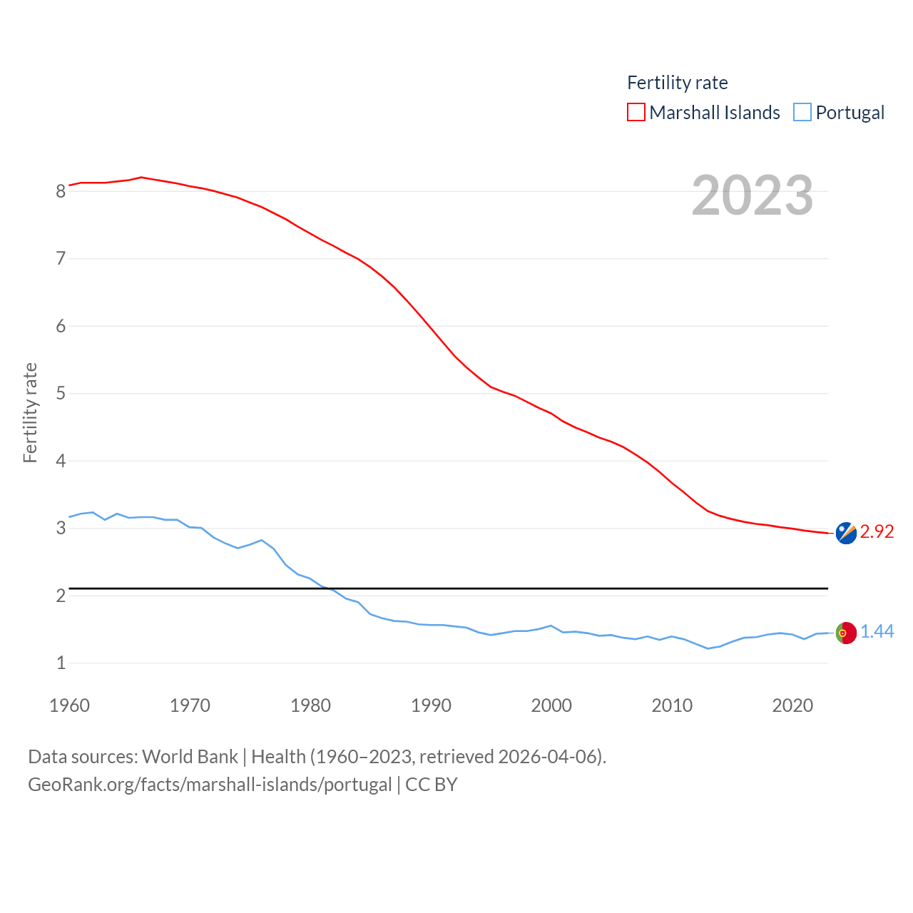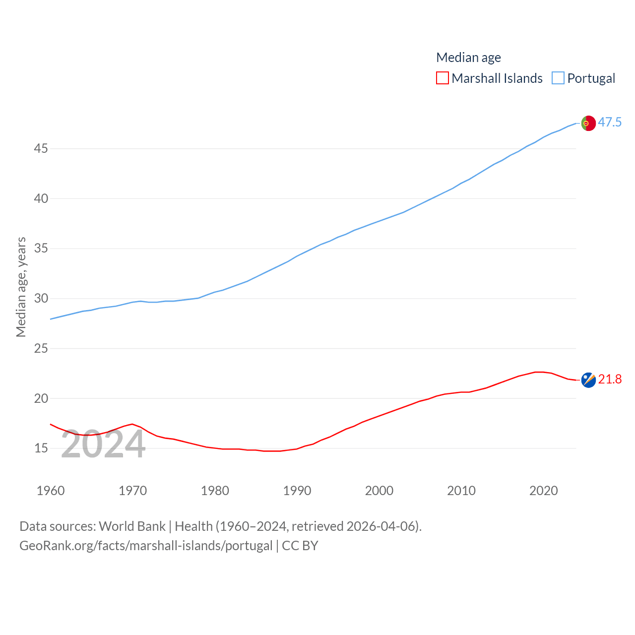 The Marshall Islands has a population of 37.5K (ranked 192/197), compared with 10.7M in Portugal (ranked 90/197). The Marshall Islands' land area is 69.5 sq mi versus 35,369 sq mi for Portugal (ranked 191st vs. 108th).