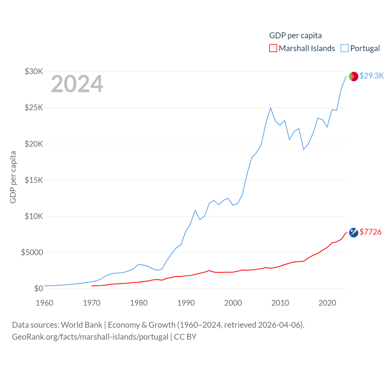 By GDP, The Marshall Islands ranks 193/197 ($290M) and Portugal ranks 46/197 ($313B). By GDP per capita, The Marshall Islands ranks 96/197 ($7,726), while Portugal ranks 44/197 ($29,292).