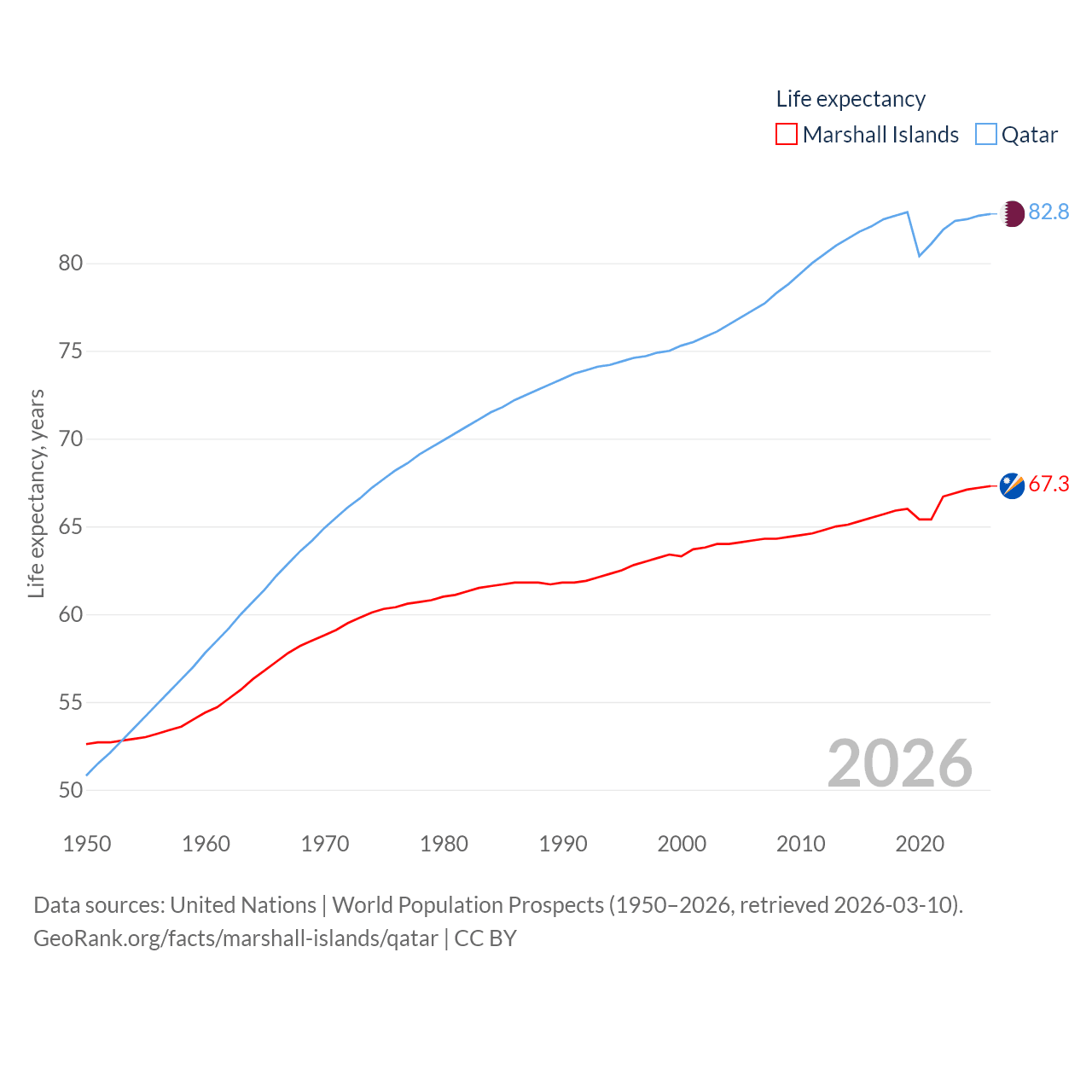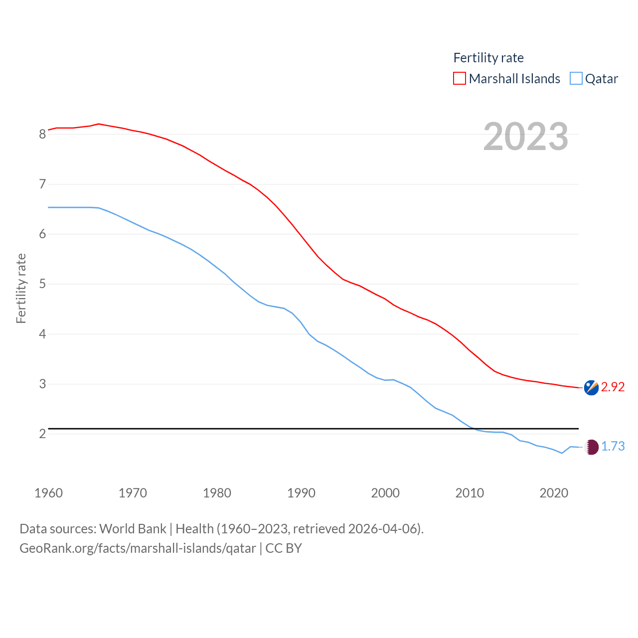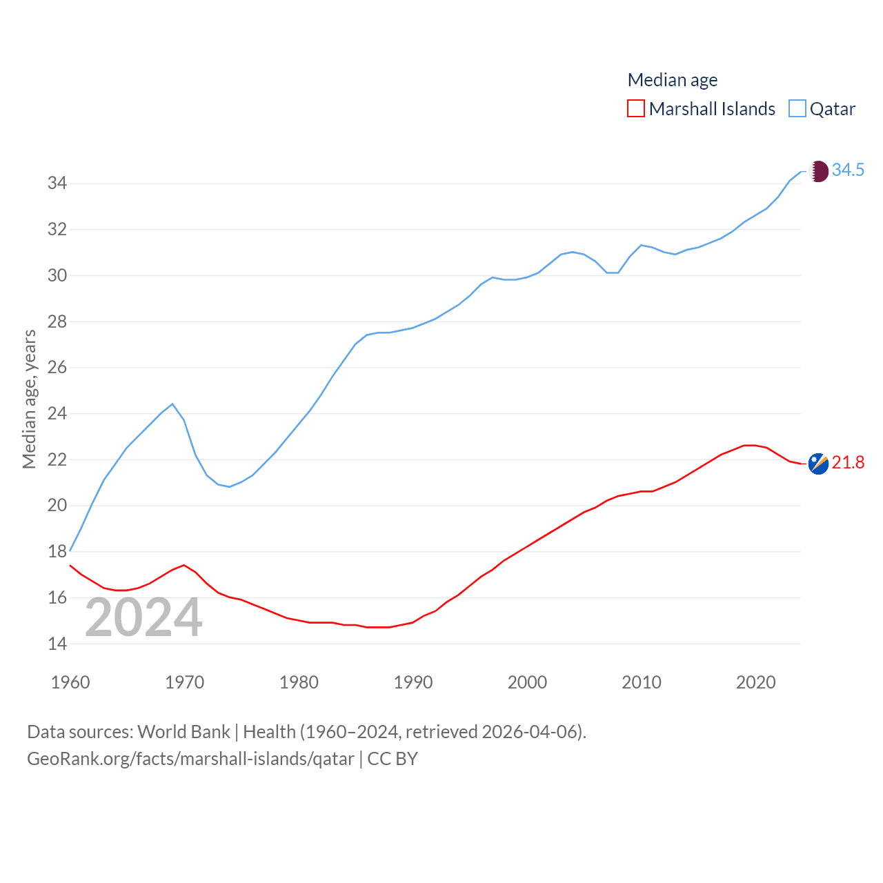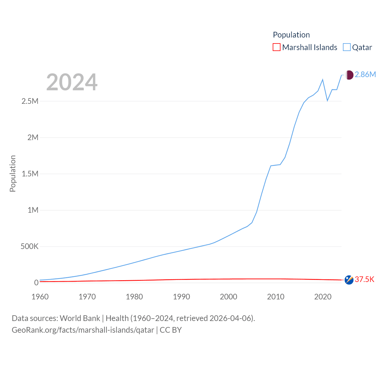 The Marshall Islands has a population of 37.5K (ranked 192/197), compared with 2.86M in Qatar (ranked 138/197). The Marshall Islands' land area is 69.5 sq mi versus 4,436 sq mi for Qatar (ranked 191st vs. 158th).