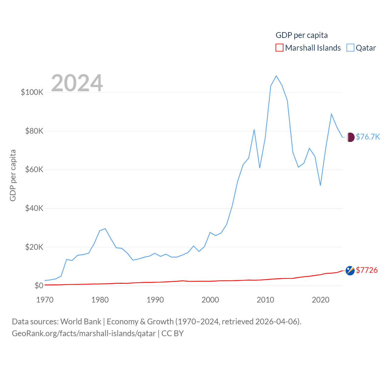 By GDP, The Marshall Islands ranks 193/197 ($290M) and Qatar ranks 56/197 ($219B). By GDP per capita, The Marshall Islands ranks 96/197 ($7,726), while Qatar ranks 11/197 ($76,689).