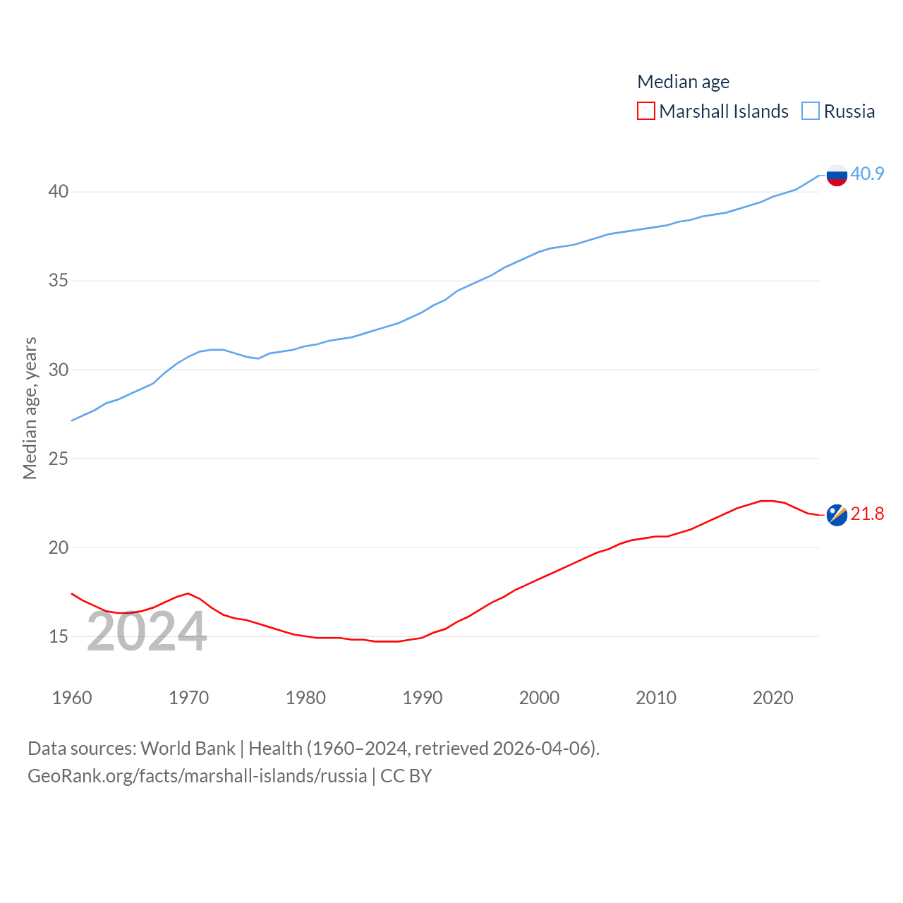 The Marshall Islands has a population of 37.5K (ranked 192/197), compared with 144M in Russia (ranked 9/197). The Marshall Islands' land area is 69.5 sq mi versus 6,323,145 sq mi for Russia (ranked 191st vs. 1st).