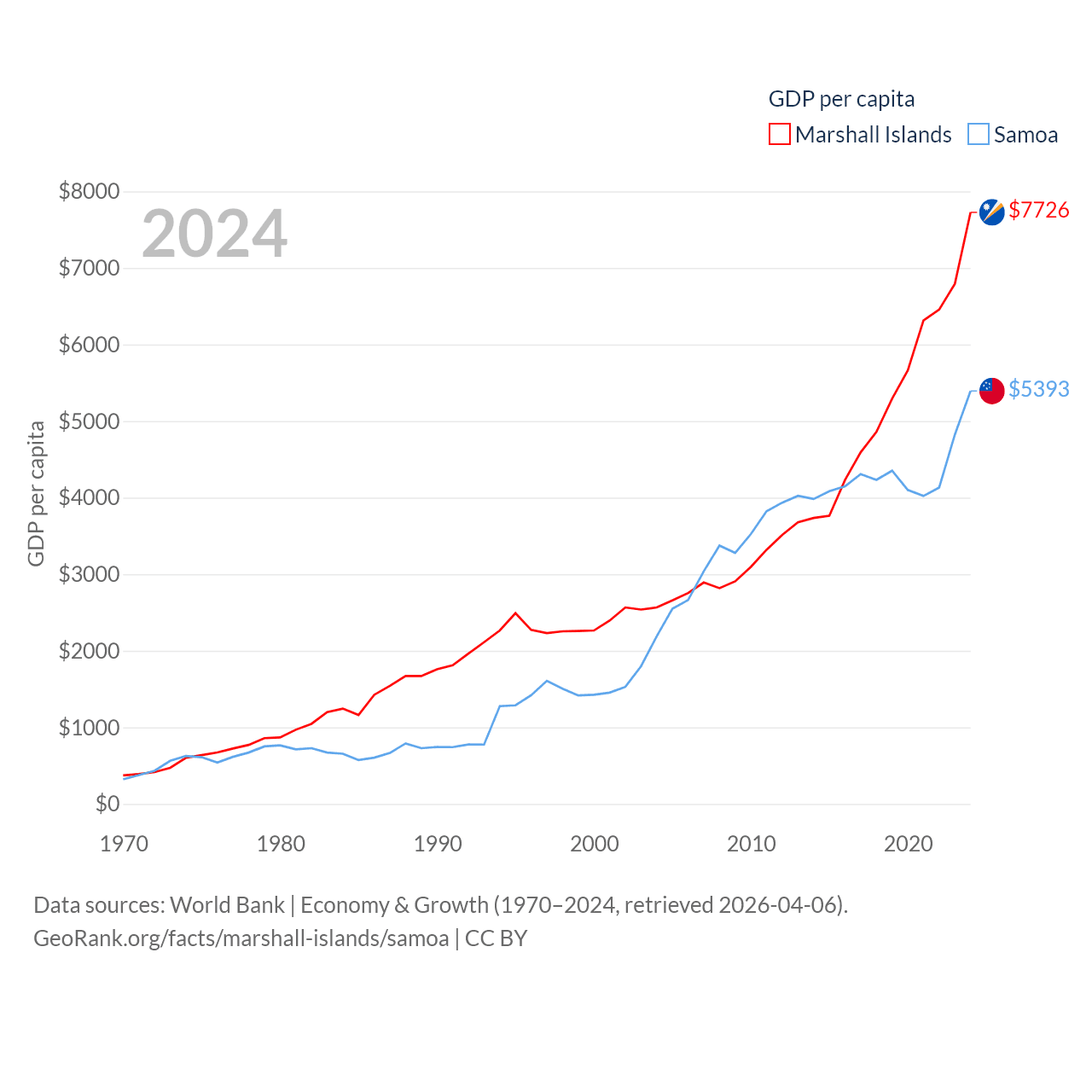 By GDP, The Marshall Islands ranks 193/197 ($290M) and Samoa ranks 185/197 ($1.18B). By GDP per capita, The Marshall Islands ranks 96/197 ($7,726), while Samoa ranks 117/197 ($5,393).