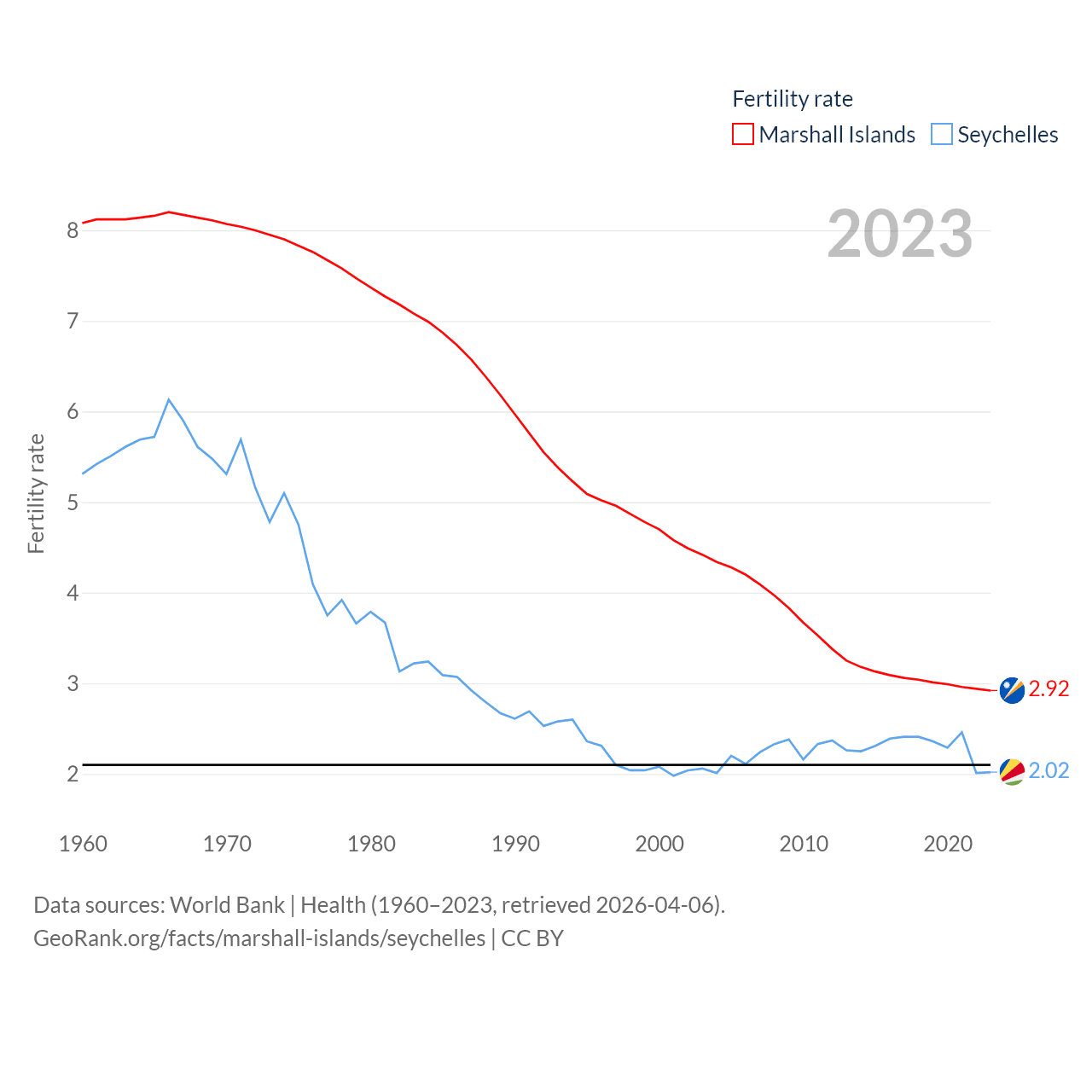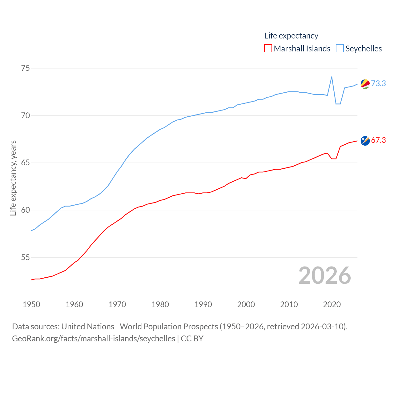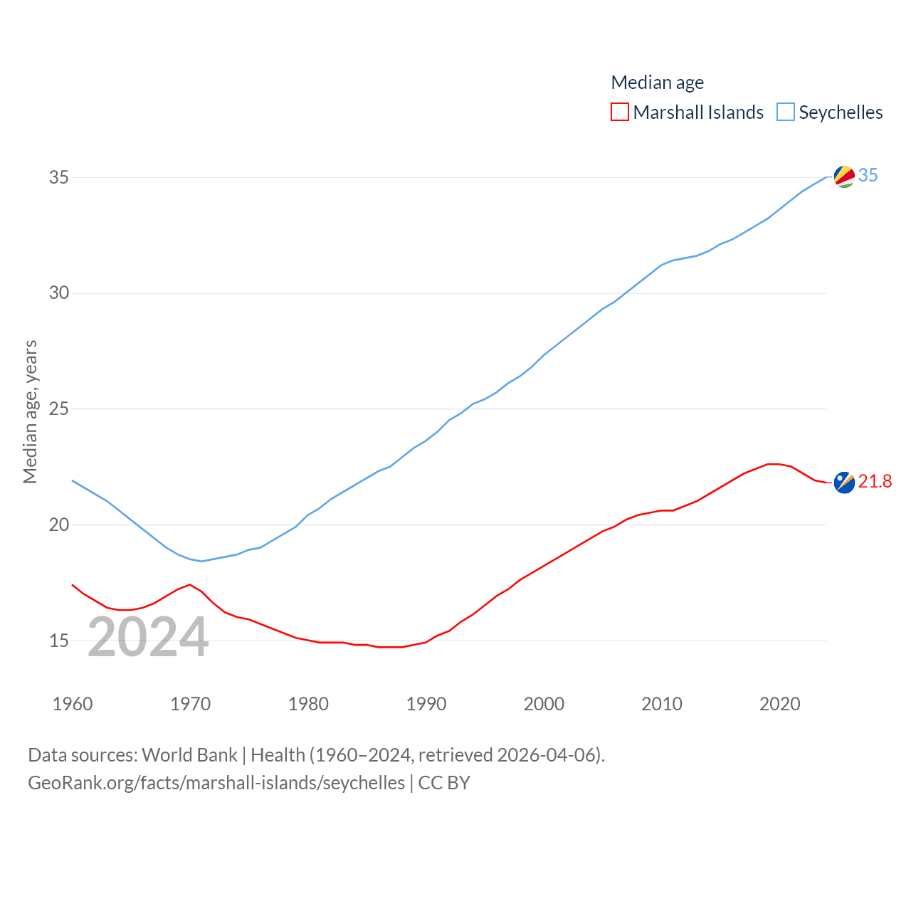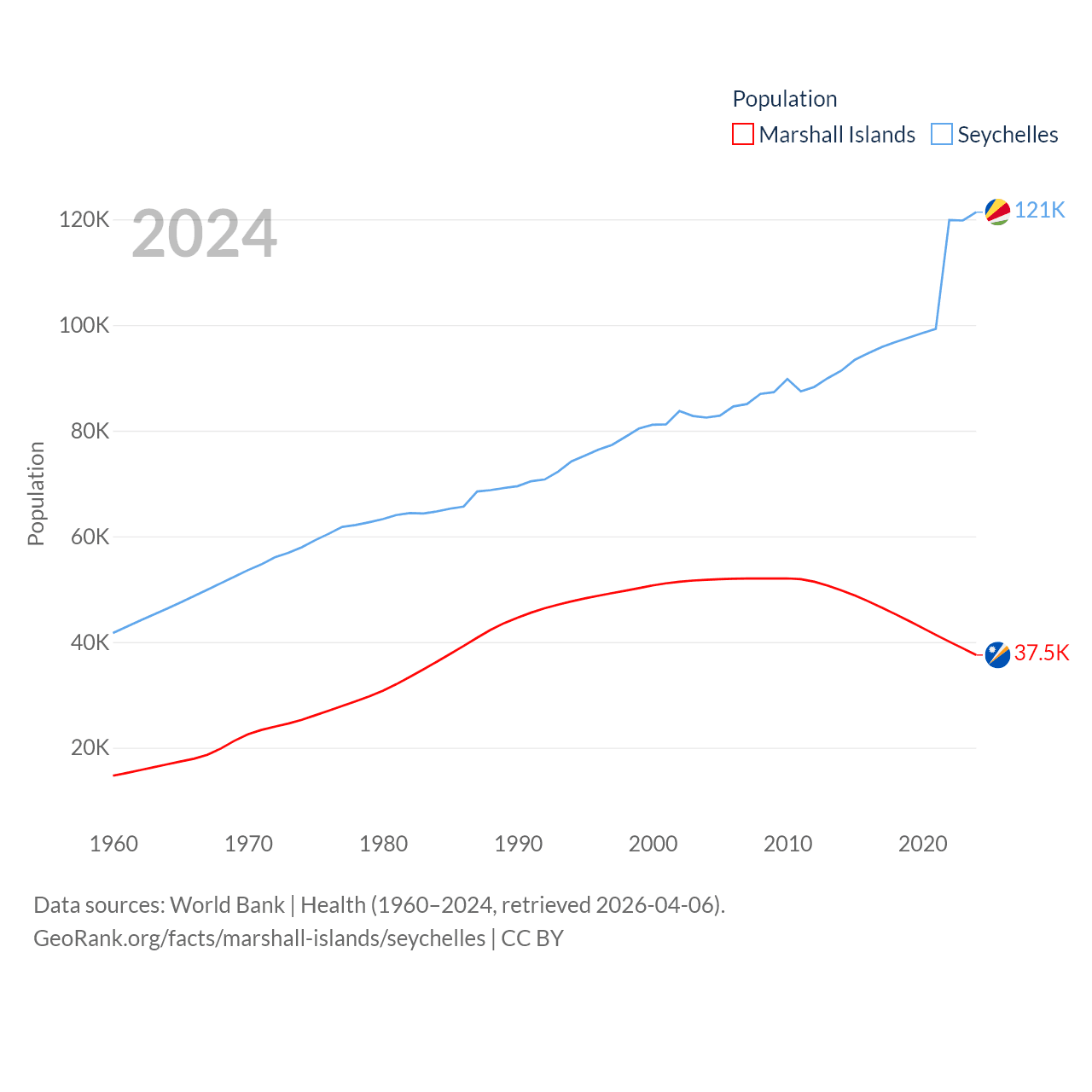 The Marshall Islands has a population of 37.5K (ranked 192/197), compared with 121K in The Seychelles (ranked 181/197). The Marshall Islands' land area is 69.5 sq mi versus 177.6 sq mi for The Seychelles (ranked 191st vs. 181st).