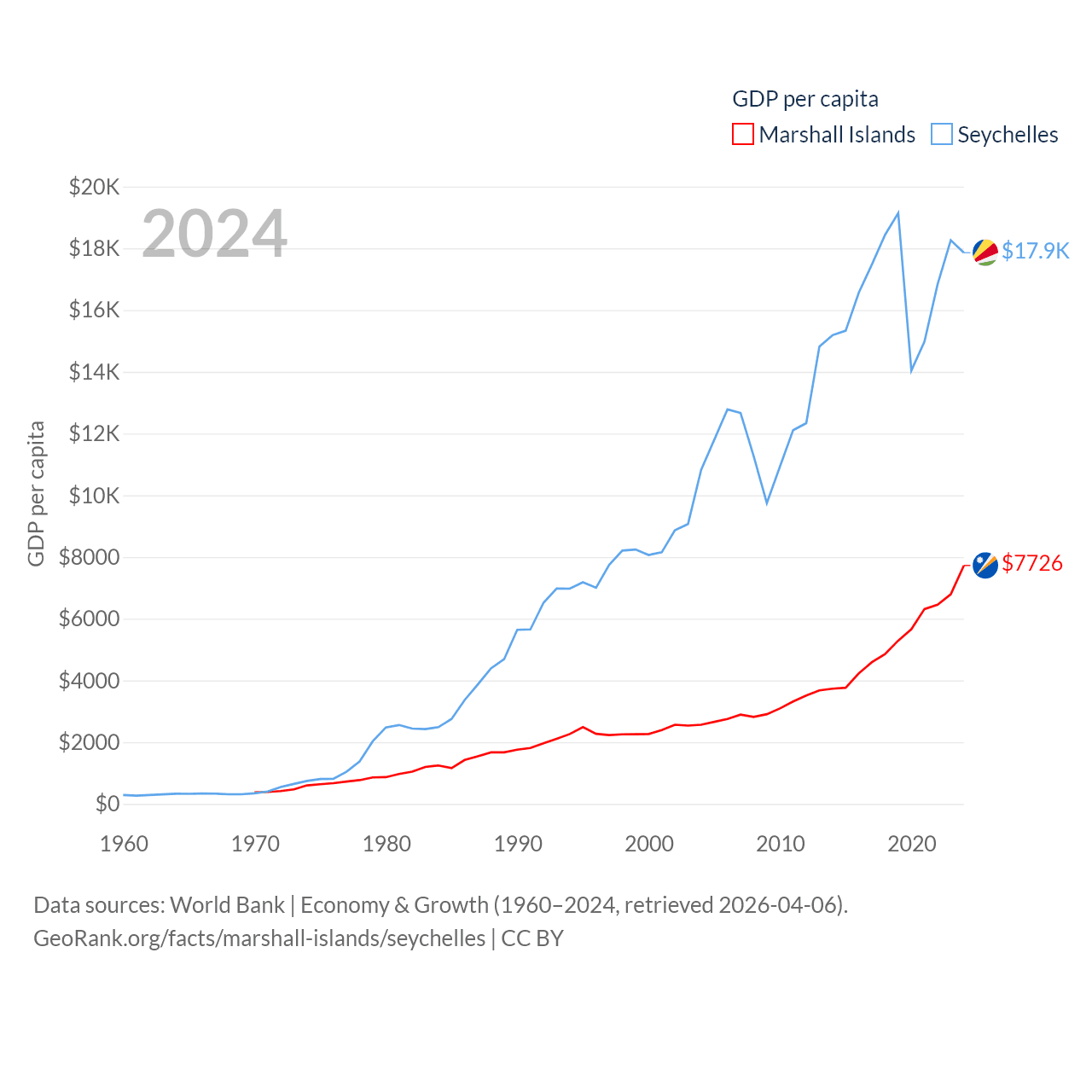 By GDP, The Marshall Islands ranks 193/197 ($290M) and The Seychelles ranks 178/197 ($2.17B). By GDP per capita, The Marshall Islands ranks 96/197 ($7,726), while The Seychelles ranks 63/197 ($17,859).